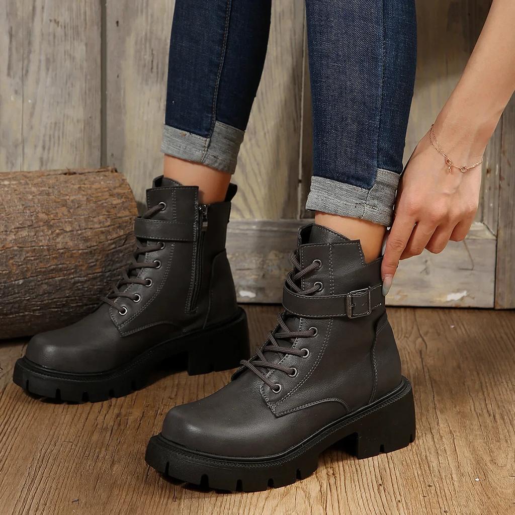 Модные женские мотоциклетные ботинки на платформе с круглым носком, модные туфли на шнуровке в стиле ретро, осень-зима, женские короткие ботильоны в стиле рыцаря Botas De Mujer