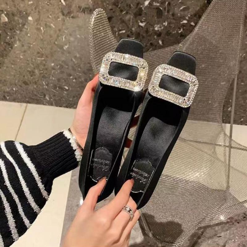 Модные туфли-лодочки с квадратным носком и неглубоким вырезом, женские, весна/осень, новые, с водными бриллиантами и квадратной пуговицей, шелковые туфли на высоком каблуке, женские
