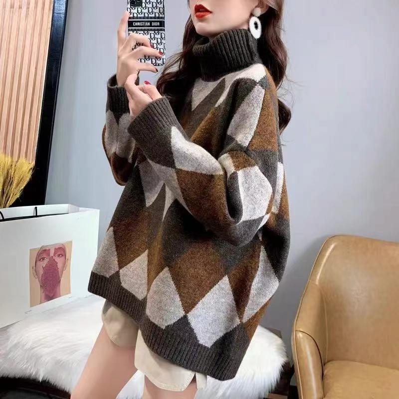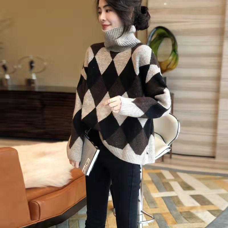 Модные повседневные пуловеры вязаный свитер для женщин осень свободный полувысокий воротник зимний джемпер свитера женские с длинным рукавом ретро ромбовидный трикотаж 25406