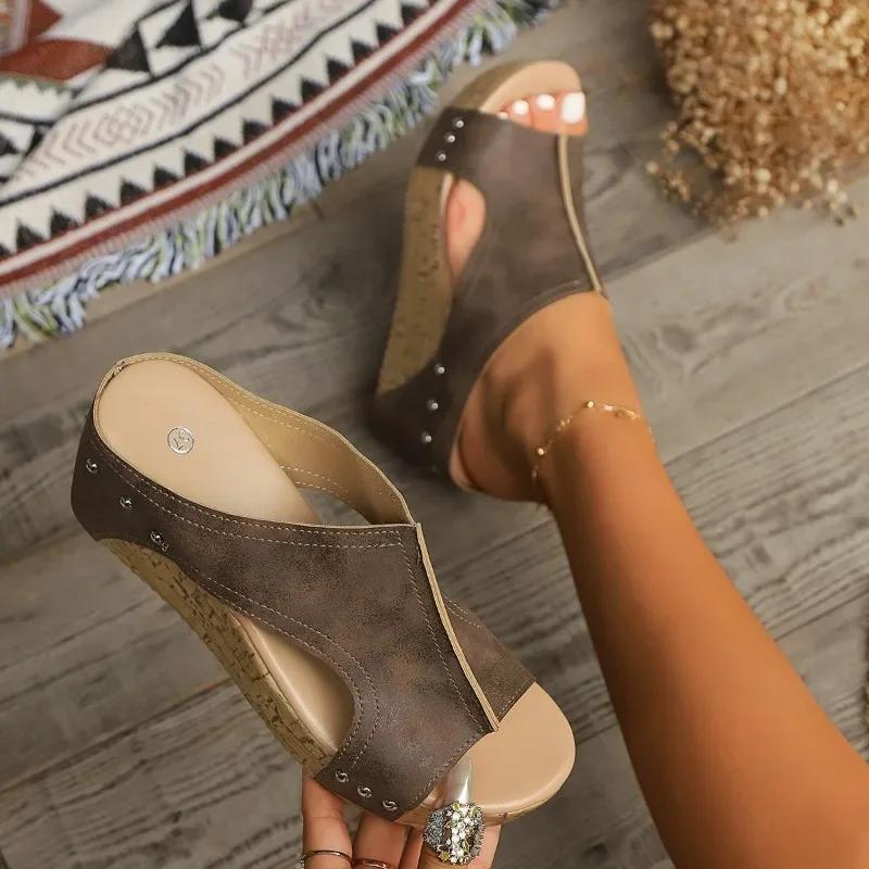 Мода 2024 года. Новые женские римские сандалии. Повседневные тапочки с заклепками и деревянной подошвой. Каблук-танкетка. Женская обувь. Zapatos.
