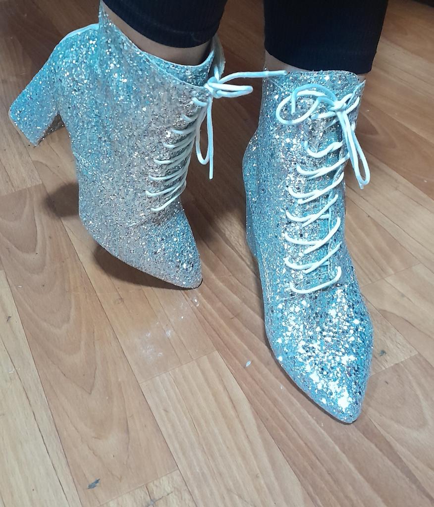 У меня размер 40ой,форма обуви реально худит ногу,очень красиво,правда только с упаковки тяжело застегиваются, пока,очень лёгкие ,каблук удобный,цвет на фото немного отличается из-за освещения.По факту ярко серебрянные-блестят.Материал как картон, обшитый тканью внутри на ощупь,не знаю на долго ли хватит,но на мероприятие под платье самое то.Спасибо продавцу Джум.