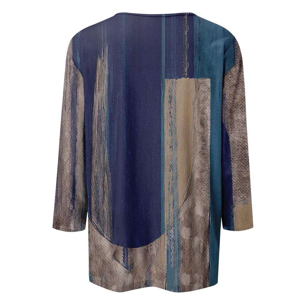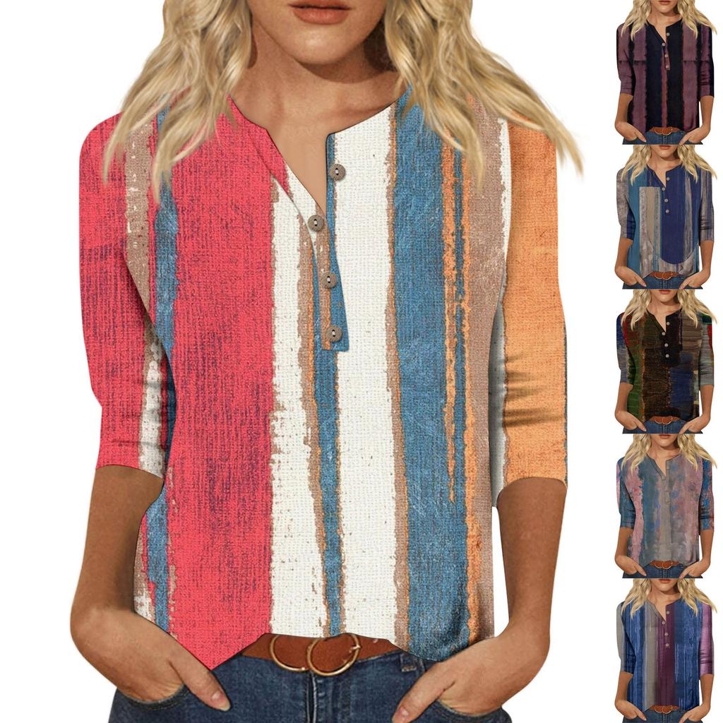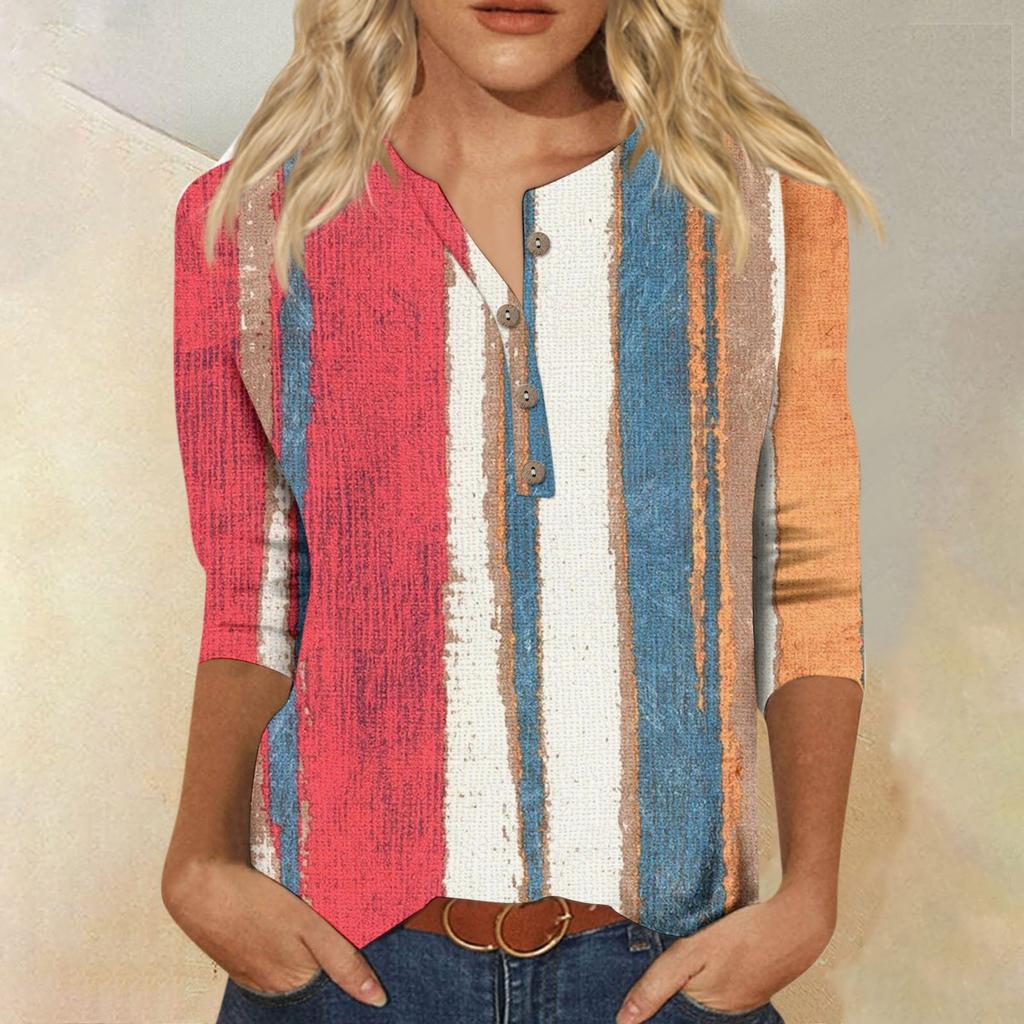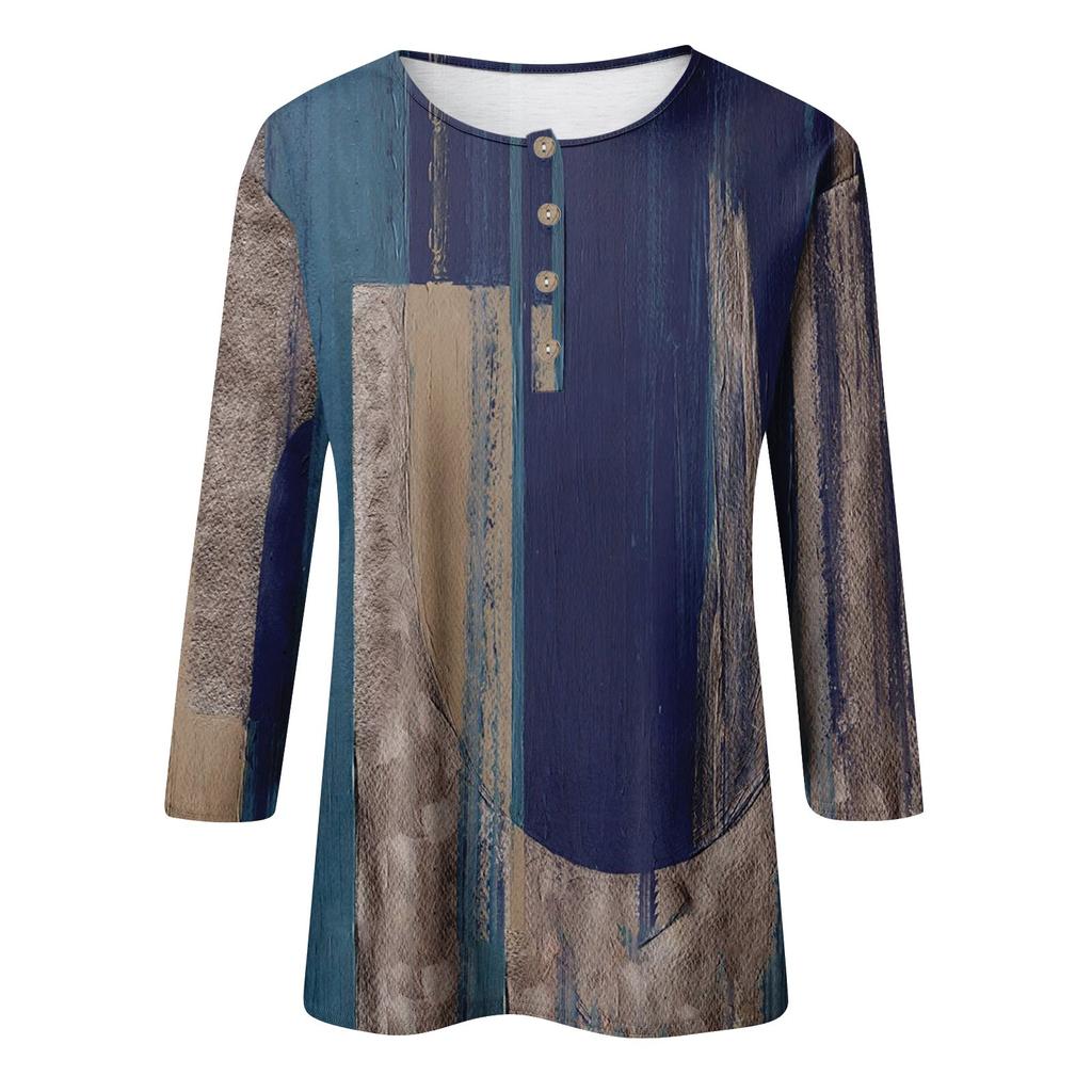 Женская мода Повседневная новая пуговица с круглым вырезом и рукавами 3/4 Свободная футболка с принтом Женский топ