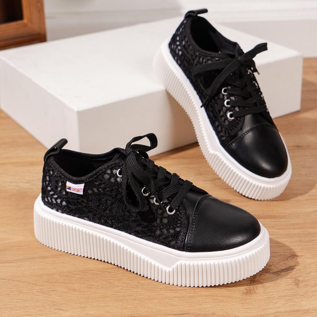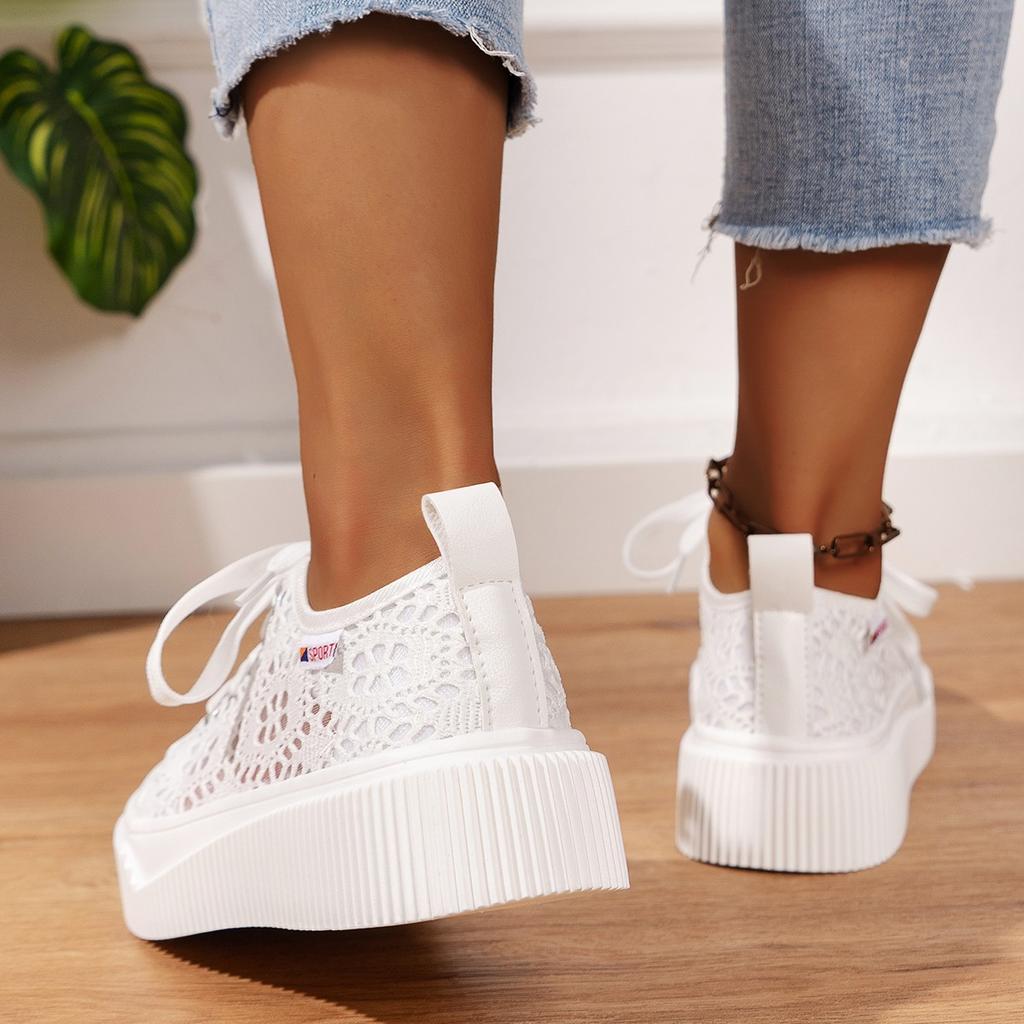 Мода 2024 Весна Повседневная Плоская Обувь Женские Корейские Круглые Кружева Сетка Дышащие Шнуровка Белые Туфли Платформа Холст Hombre Кроссовки