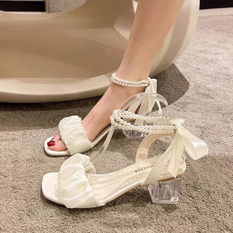 Модная удобная обувь для женщин на блочном каблуке сандалии с жемчугом, женский бежевый универсальный массивный 2024 для девочек, средний прозрачный черный гладиатор