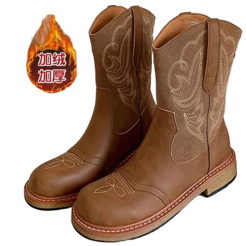 Мода 2024 года, новые кожаные сапоги SyfIyno в стиле вестерн до середины голени с вышивкой, женские осенне-зимние ботильоны, женские сапоги, теплая хлопковая обувь