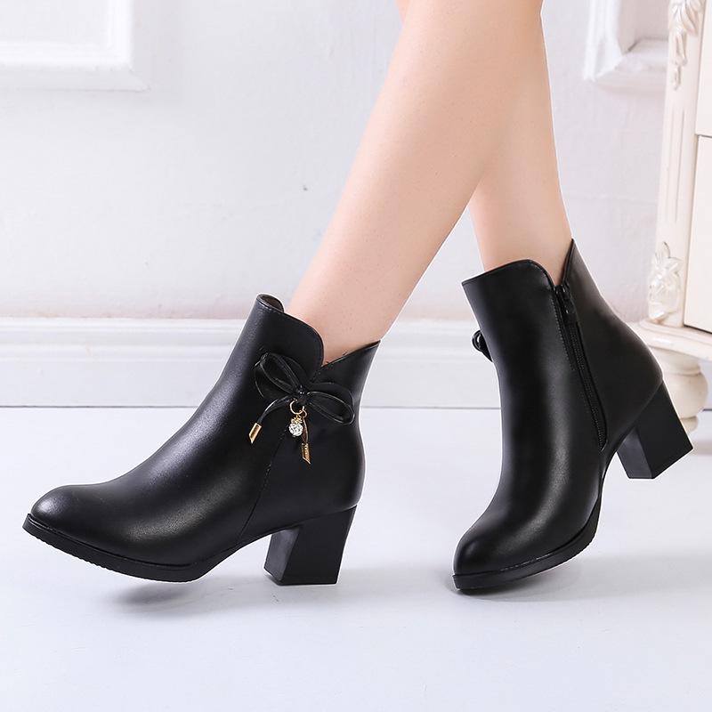 Модные женские сапоги, черные кожаные ботильоны для женщин, сапоги на высоком каблуке с бантом, осенняя женская обувь Botas Mujer asd34
