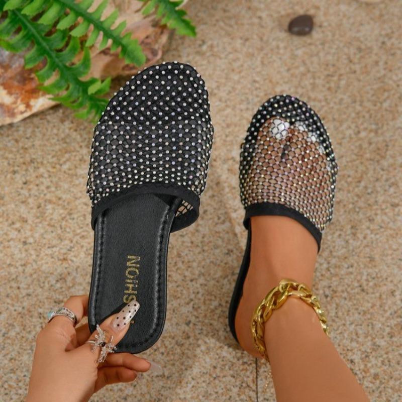 Модная горячая женская обувь 2024 года, новые роскошные женские туфли с круглым носком и бриллиантами, женские сандалии с эластичными сетчатыми носками, тапочки