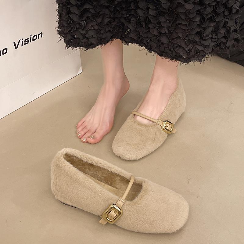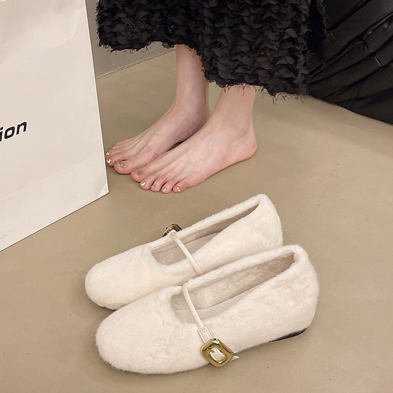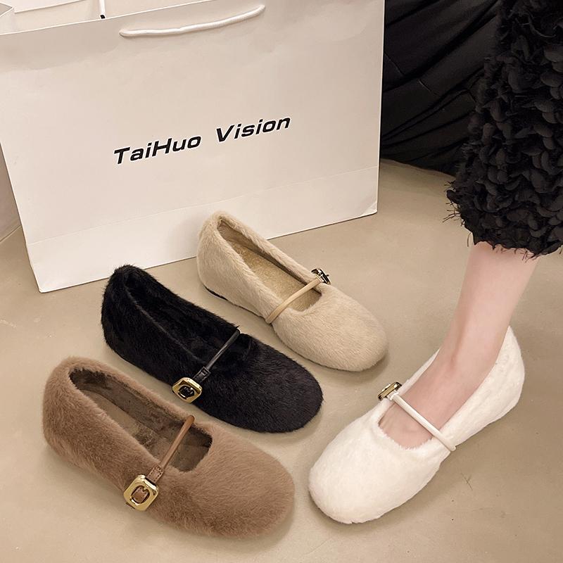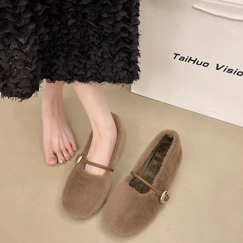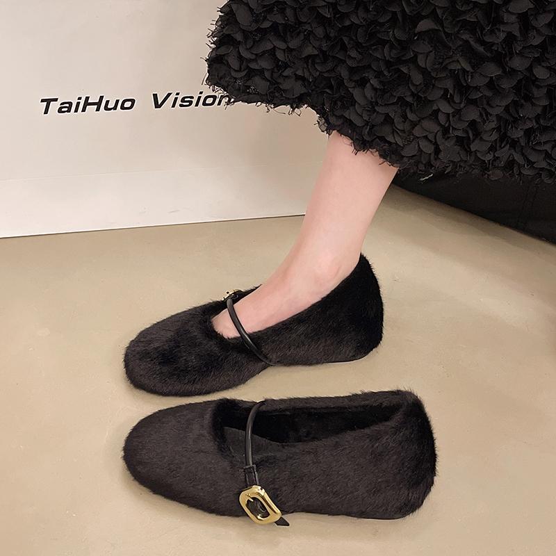 Модные туфли AJGS, новые элегантные туфли Мэри Джейн с пряжкой на ремне из меха, женские удобные мягкие пушистые балетки на плоской подошве, женские плюшевые неглубокие мокасины, лаконичное платье