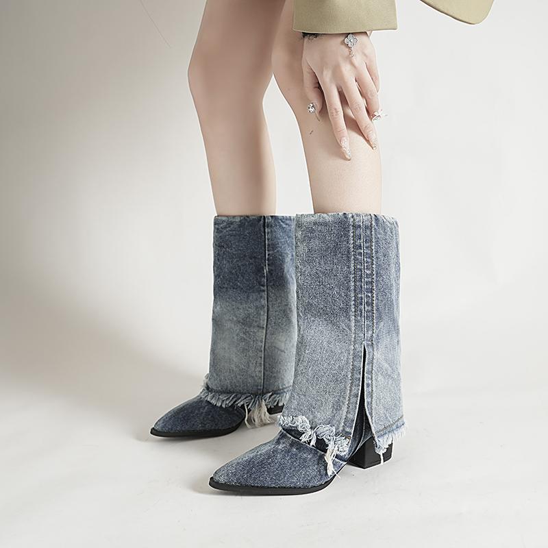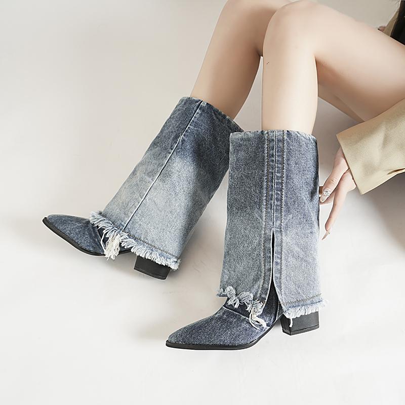 Мода 2024 Осень Новые женские ковбойские сапоги на толстом каблуке с острым носком женские модные сексуальные модные сапоги с высоким каблуком и рукавом