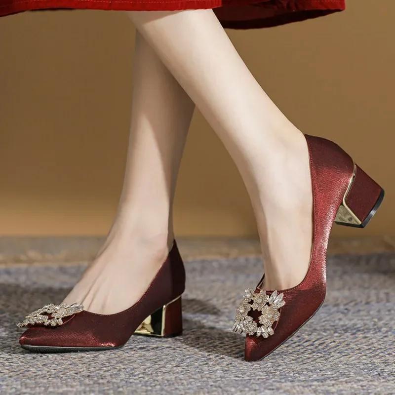 Модные туфли на высоком каблуке, женская весна, новая корейская версия, жемчужные стразы, острый нос, женская обувь, туфли на толстом каблуке, туфли-лодочки Zapatillas Mujer