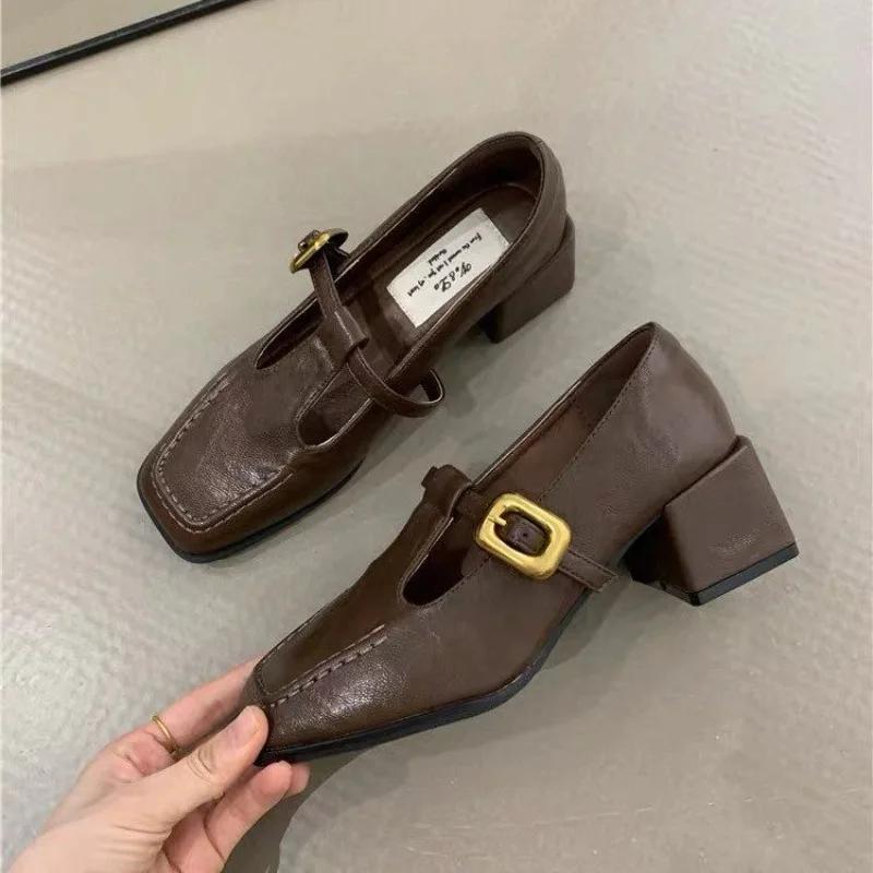 Модные французские ретро женские туфли-лодочки с квадратным носком 2024 года, новые удобные туфли на квадратном каблуке, простые и универсальные женские туфли на толстом каблуке