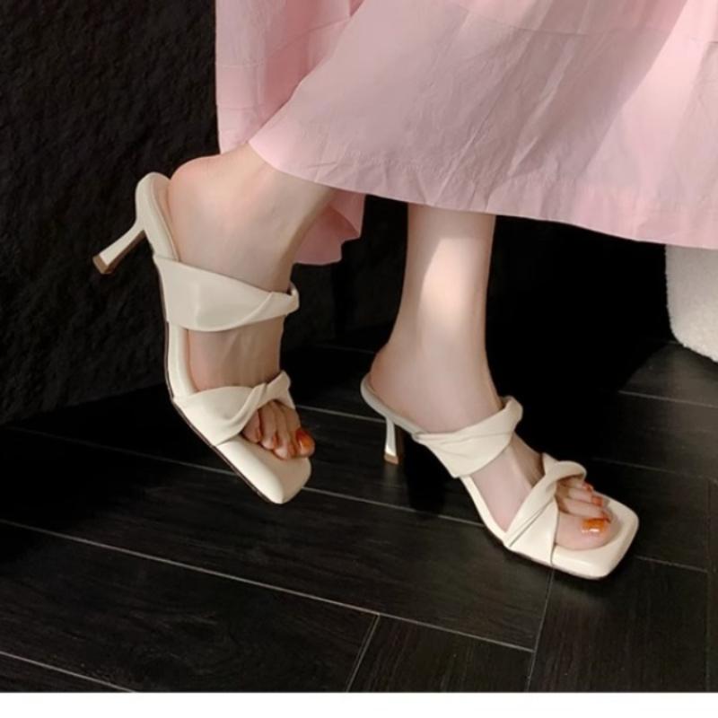 Модные летние дизайнерские женские тапочки с квадратным носком на высоком каблуке, неглубокие однотонные сандалии, женские элегантные плиссированные туфли для ходьбы на открытом воздухе, сандалии