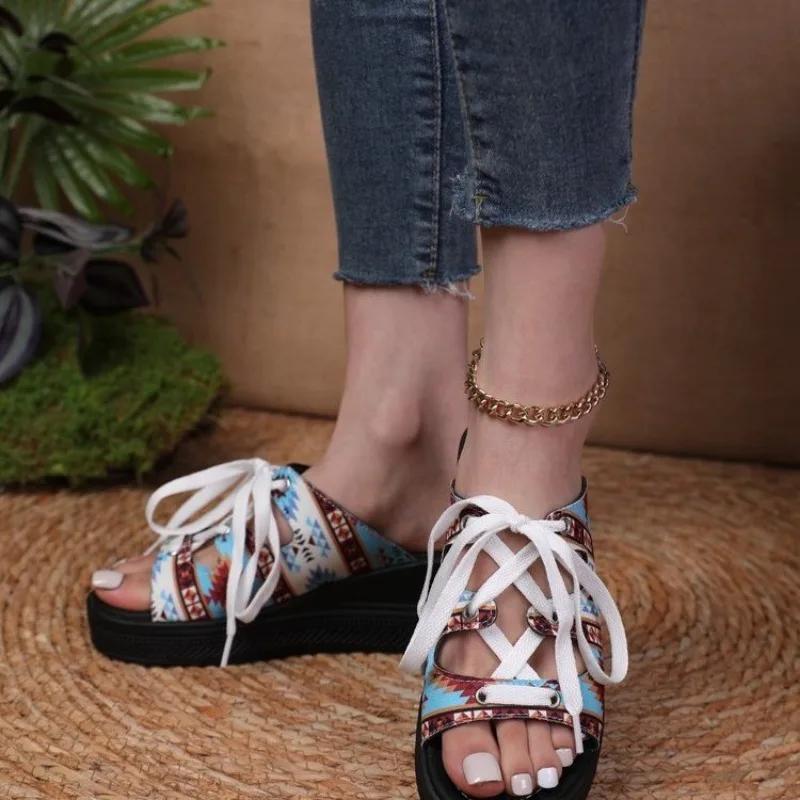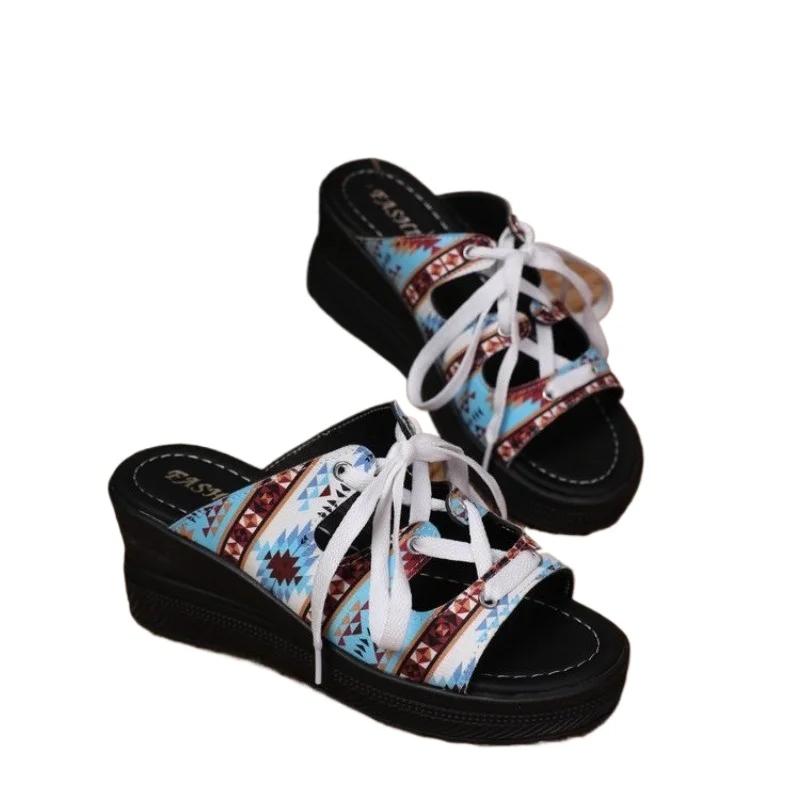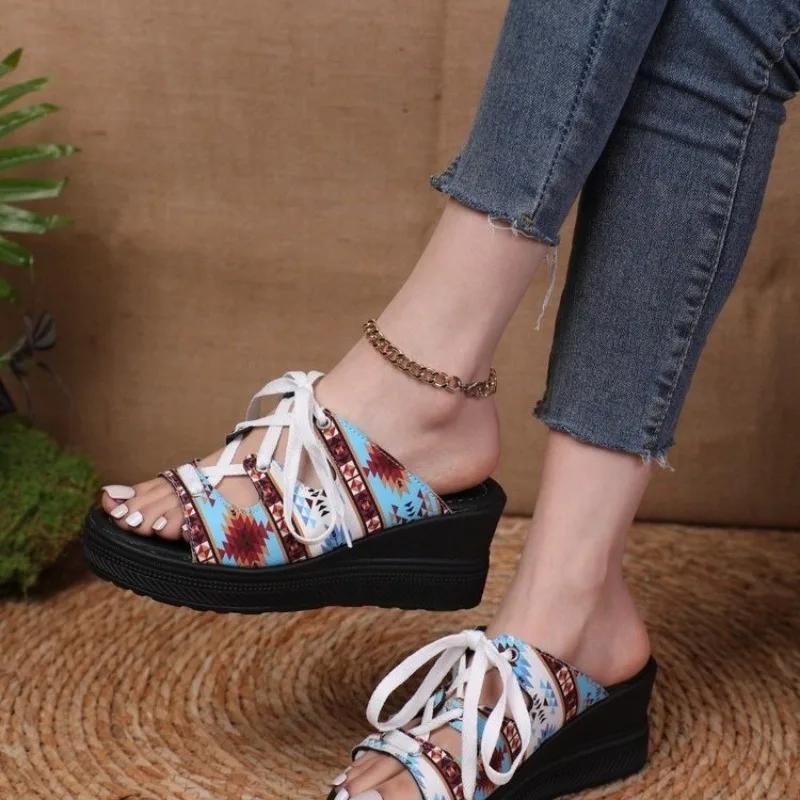 Модная обувь женская 2024 Высокое качество На шнуровке Женские шлепанцы Летний деним Открытый носок Смешанные цвета Повседневные Шлепанцы на платформе и танкетке