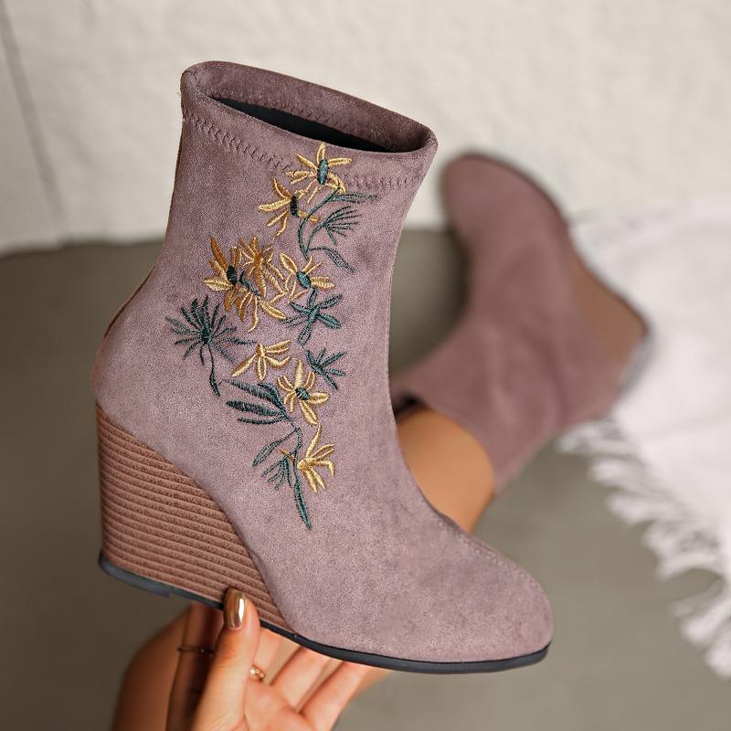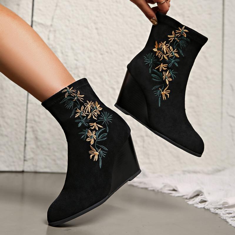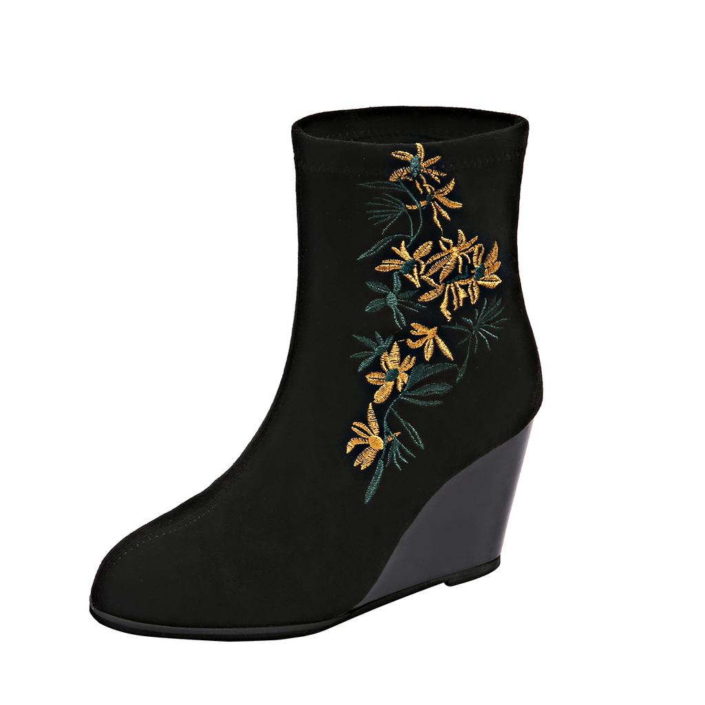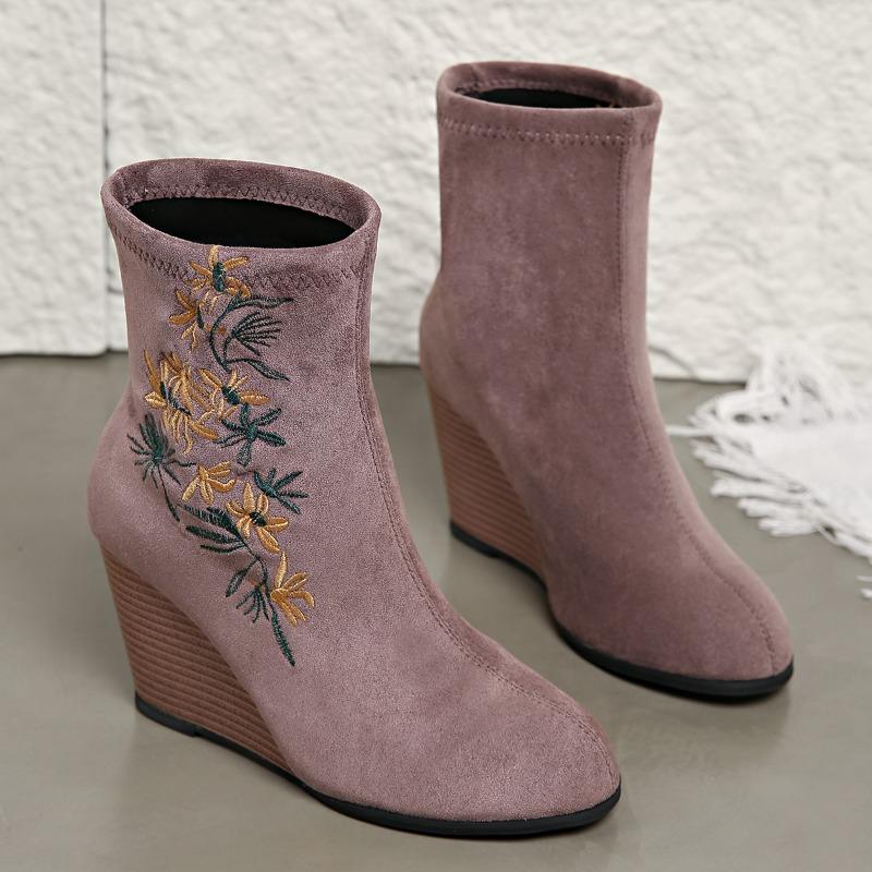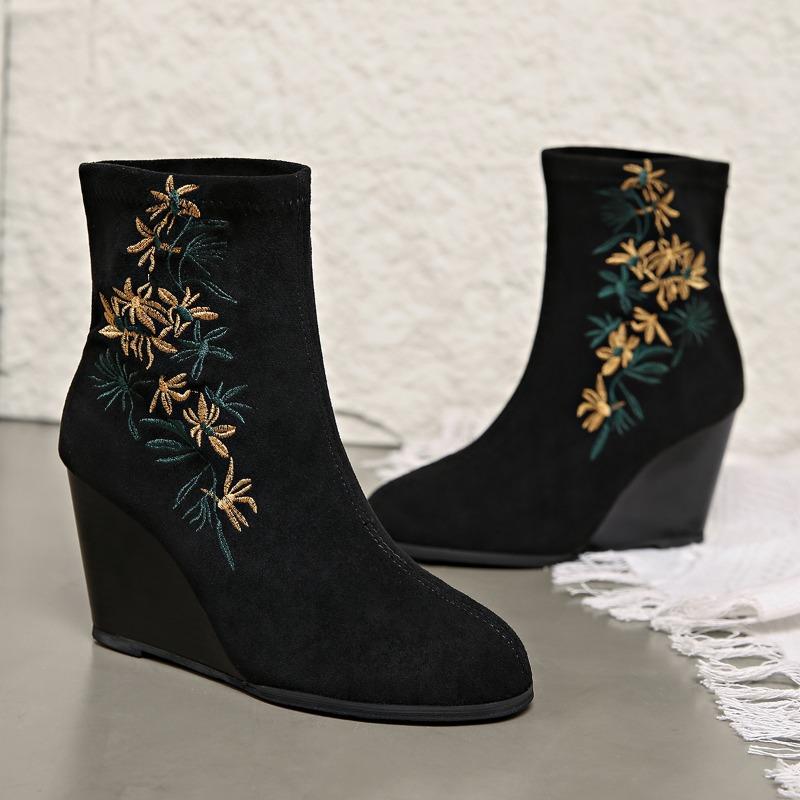 Модные осенние сапоги на каблуке-каблуке, женские замшевые сапоги с круглым носком и вышитыми рукавами, удобные узкие сапоги средней длины