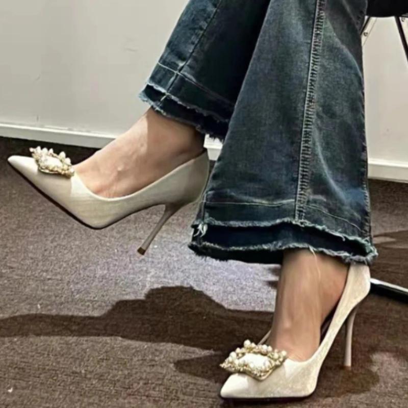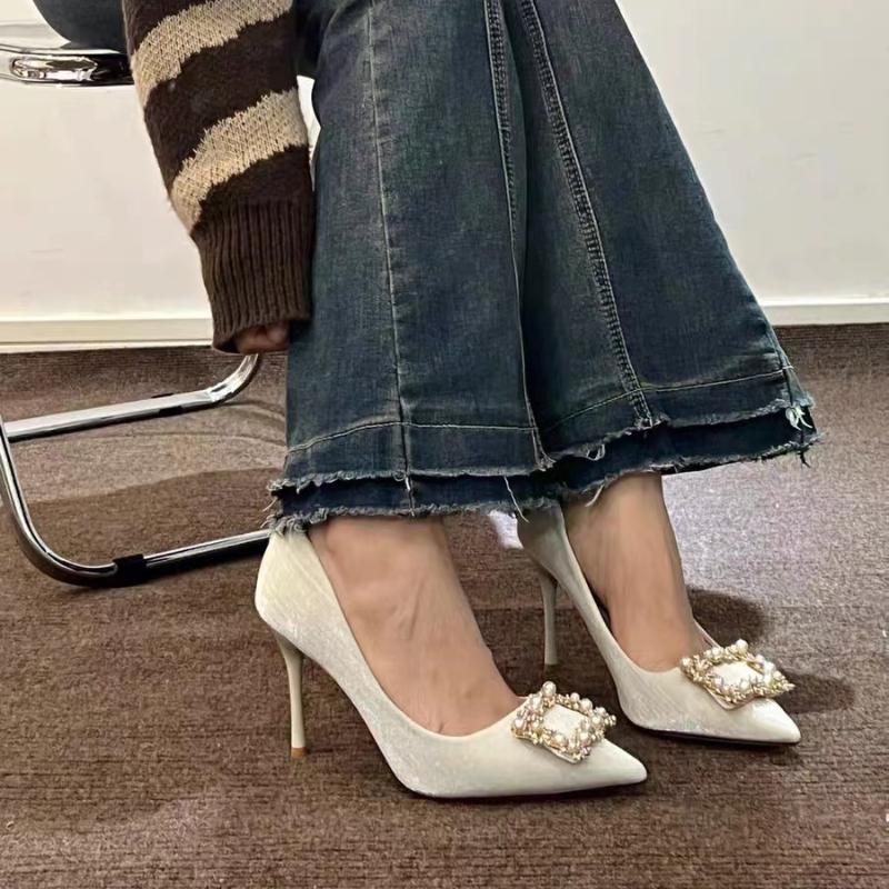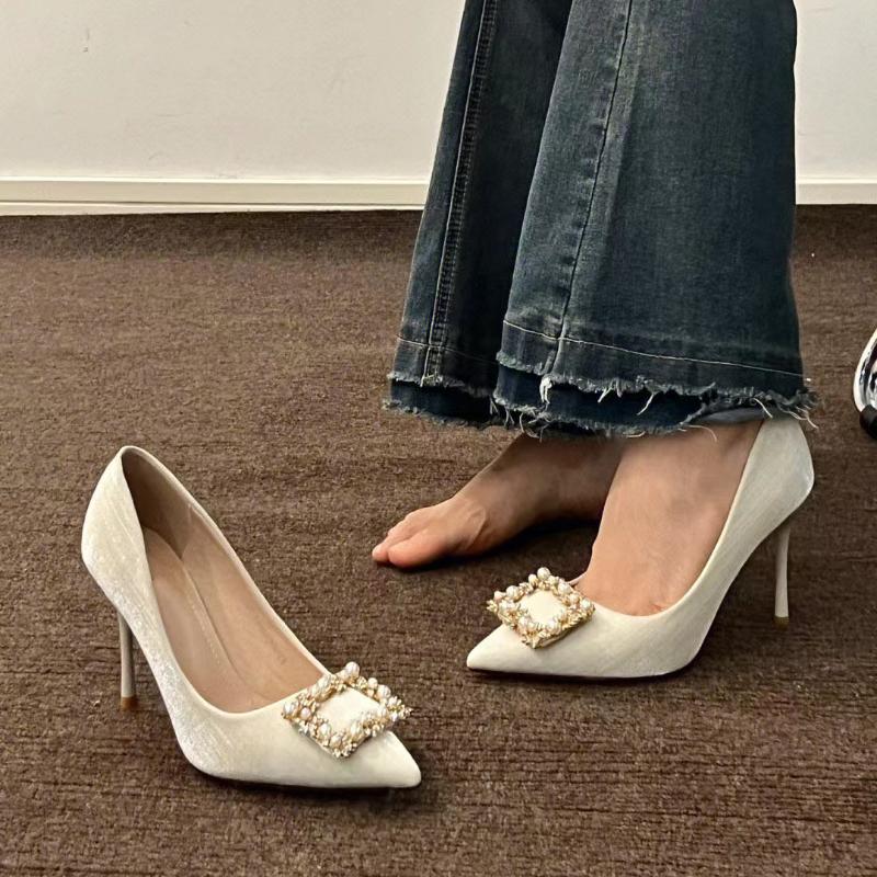 Fashion 2024 New Spring and Autumn Casual Fashion Pearl Wedding Shoes Stiletto Square Rhinestone Sexy and Comfortable High Heels