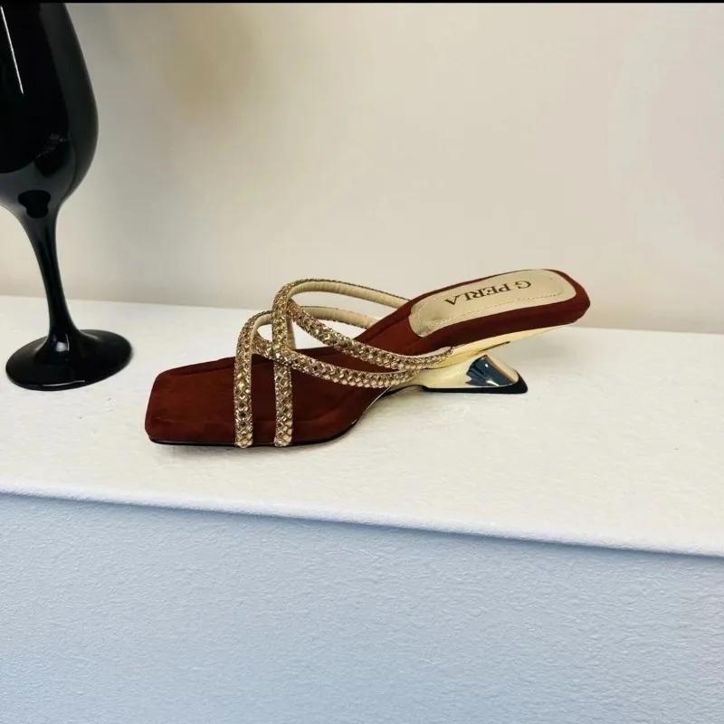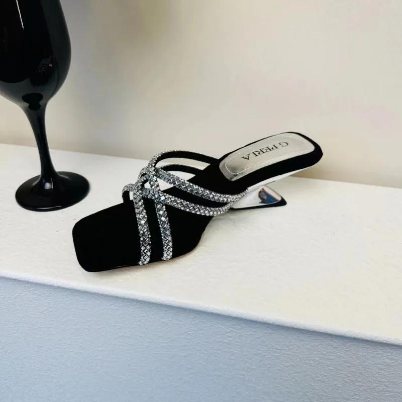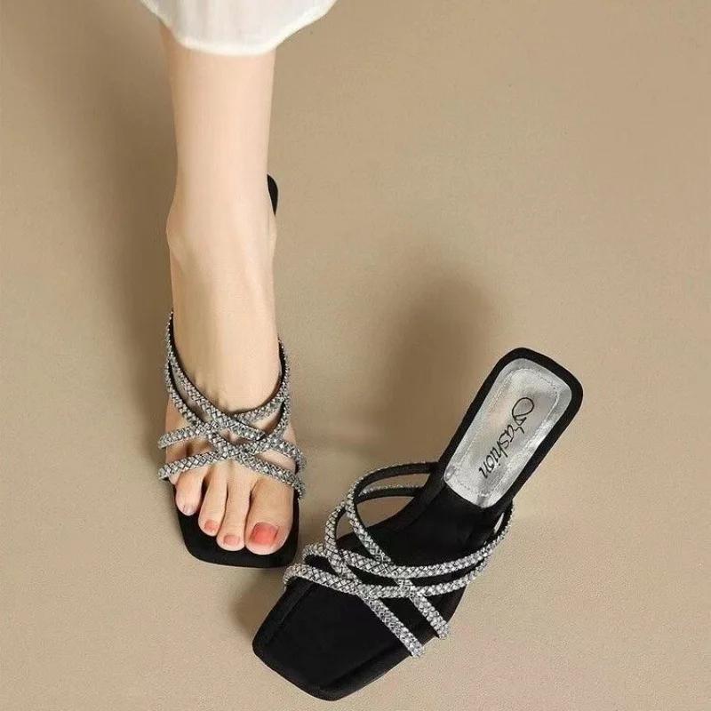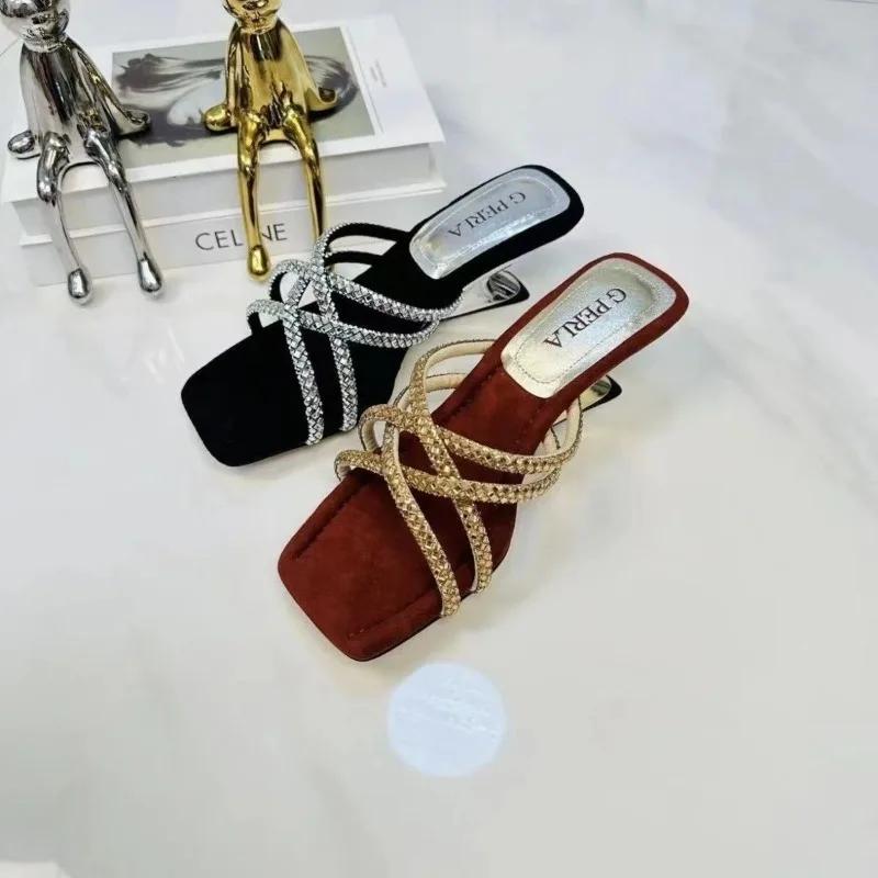 Модные летние сандалии с квадратным носком, открытым носком, пайетками, скошенным каблуком, модные, темпераментные, женские туфли