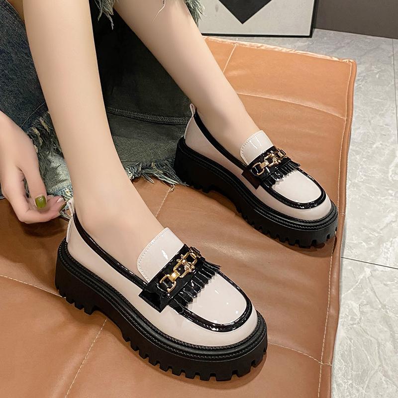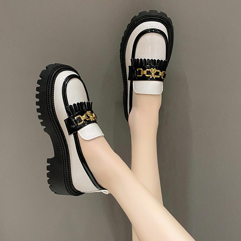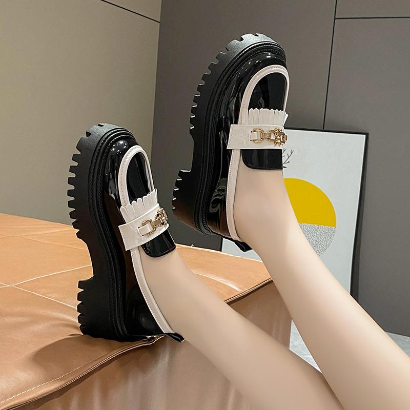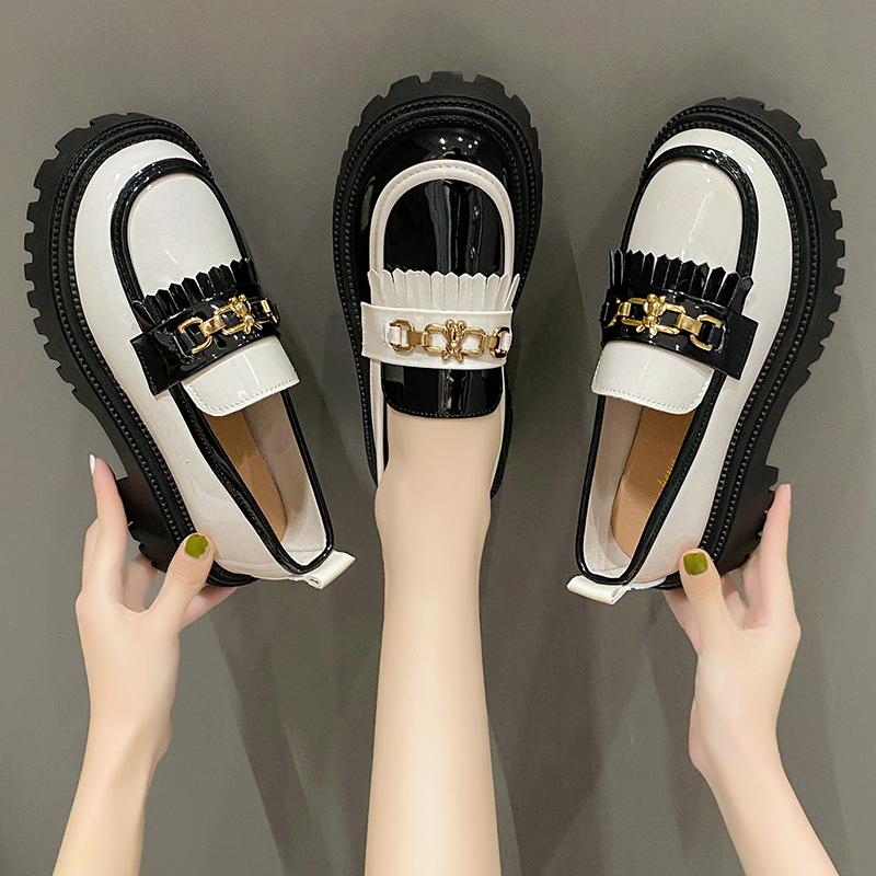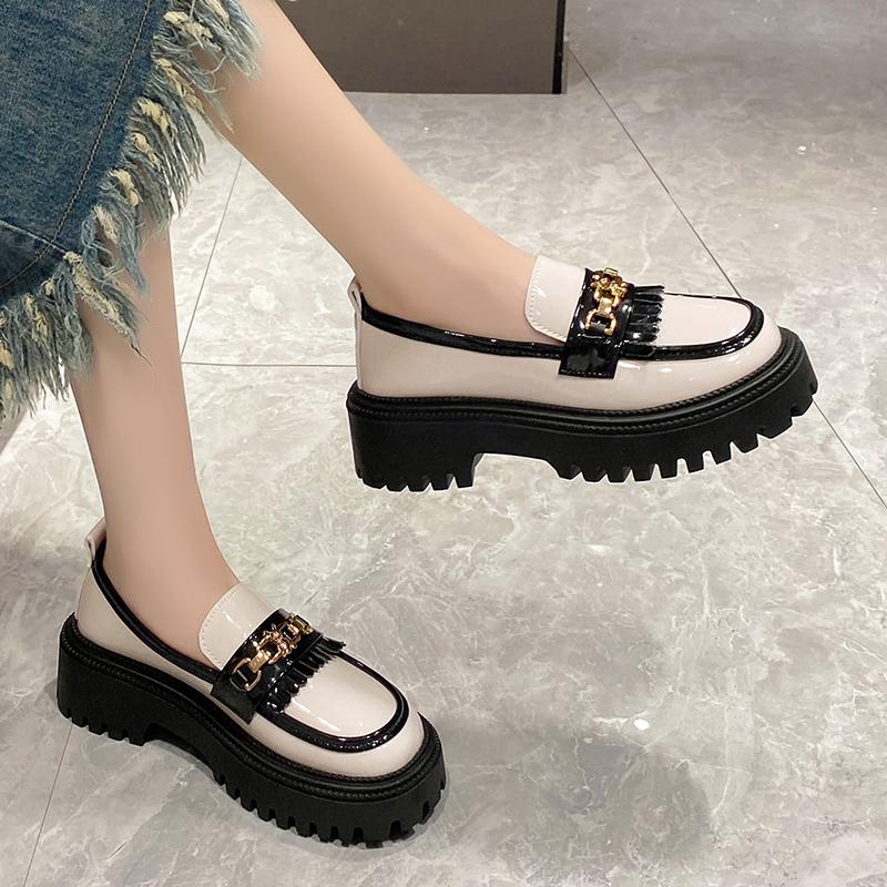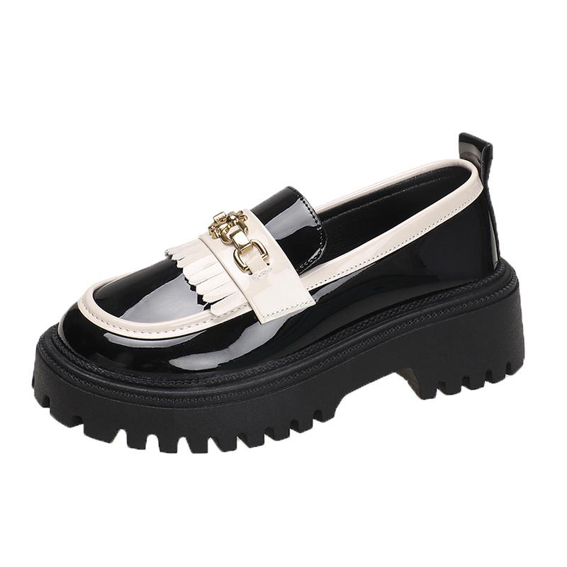 Модные женские туфли 2024 года из лакированной кожи с блестящей небольшой горловиной, одинарные туфли с цепочкой, черно-белые кисточки, британский стиль, маленькие кожаные туфли