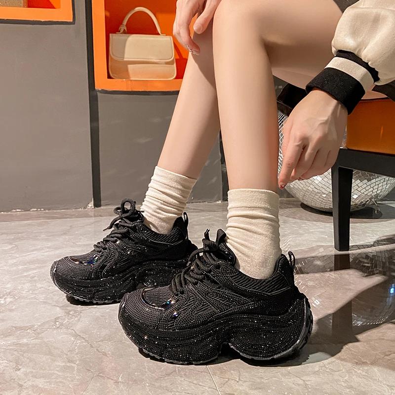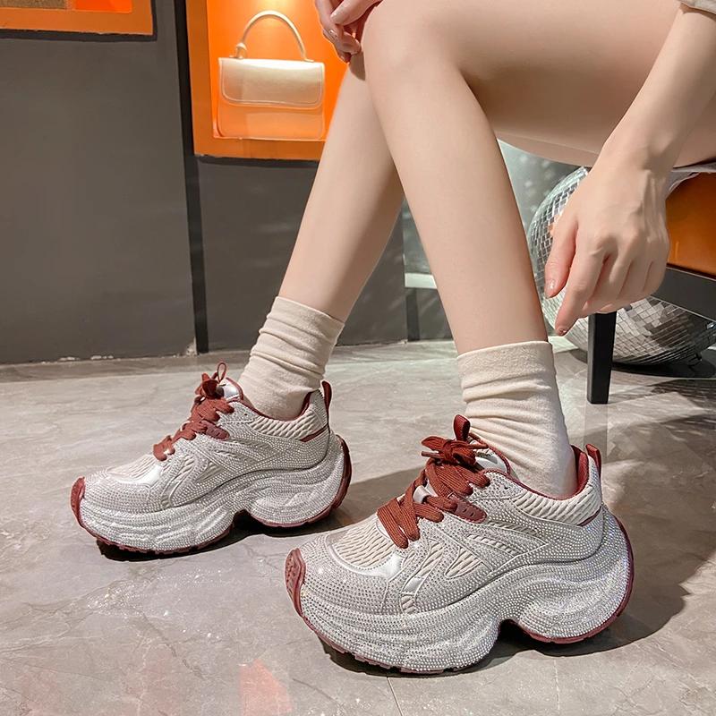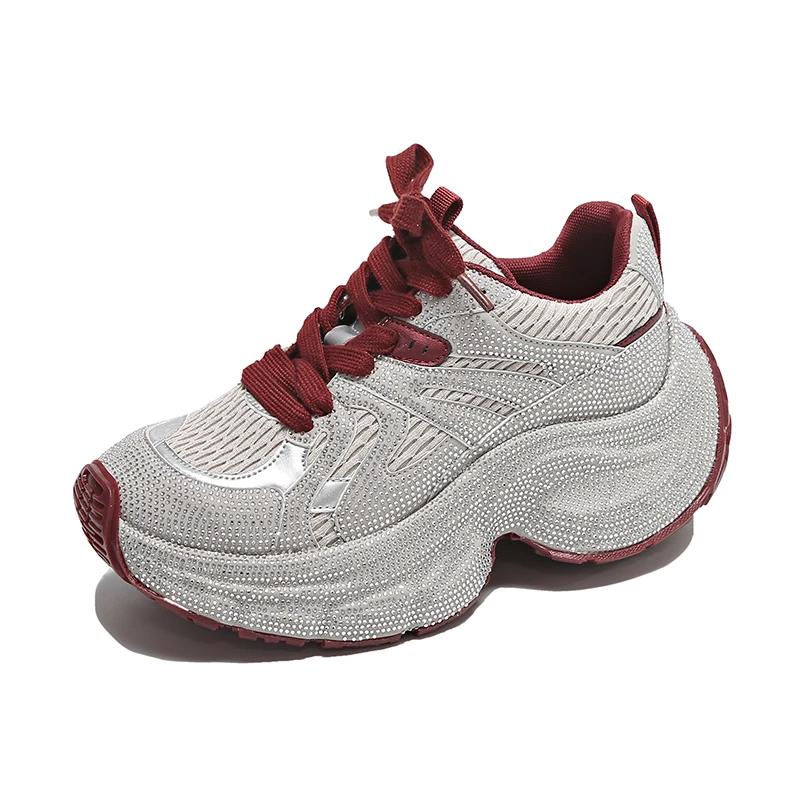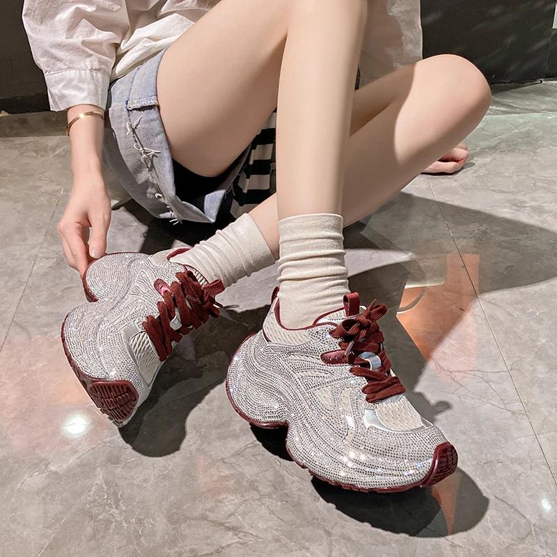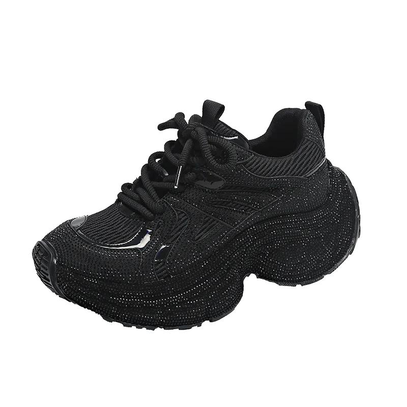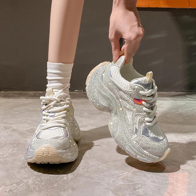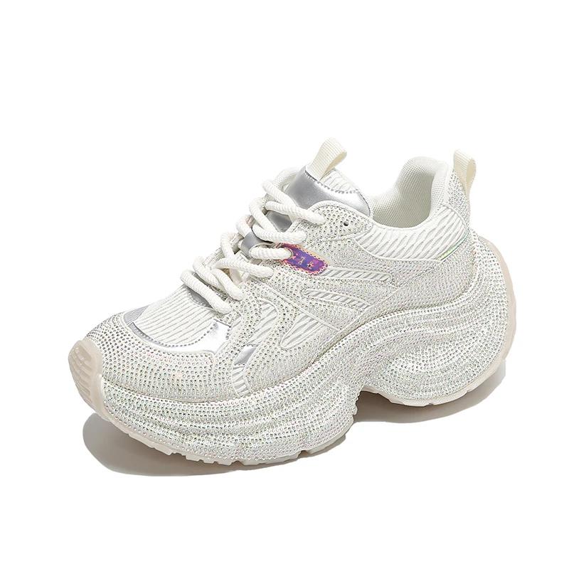 Модные роскошные женские кроссовки со стразами 2024 года, удобные и дышащие туфли для папы на толстом каблуке и платформе, повседневная женская обувь