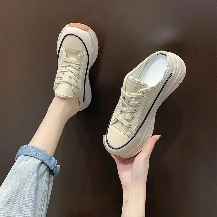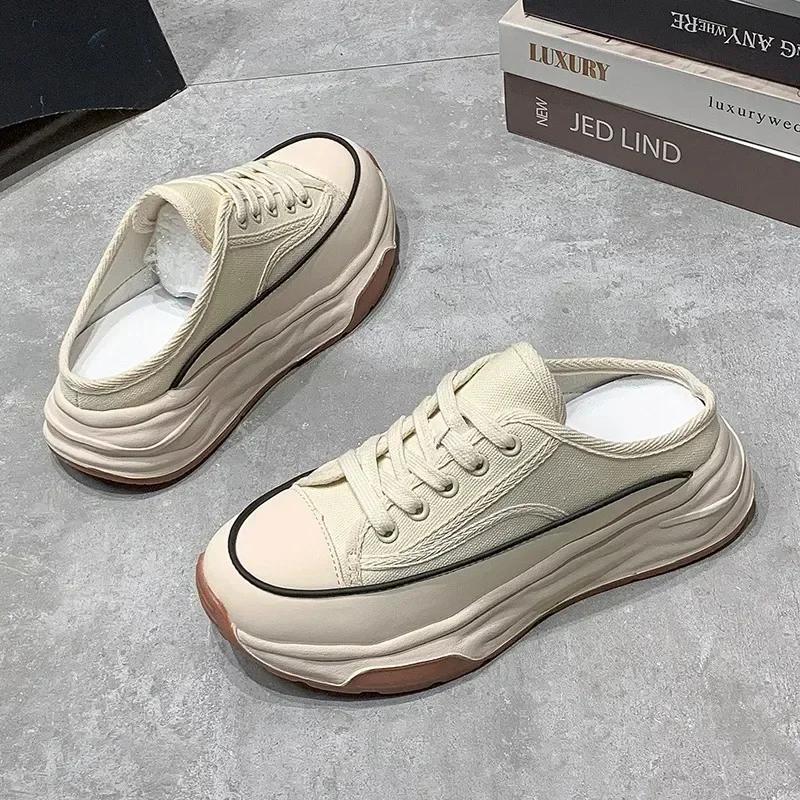 Мода 2024 Весна Осень Женские Тапочки Модные Тапочки Баотоу Полутапочки Носить Новый Стиль Маффин Шнуровка Повседневные Холщовые Тапочки Женские