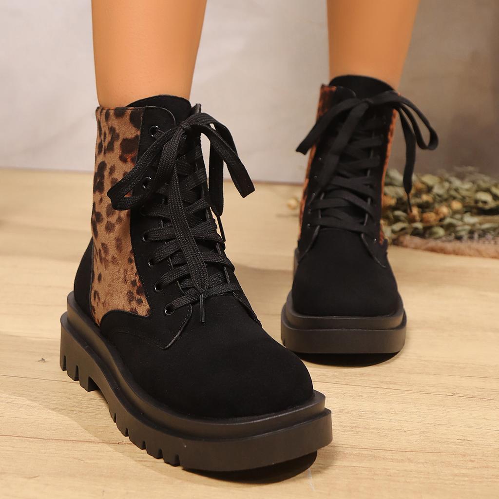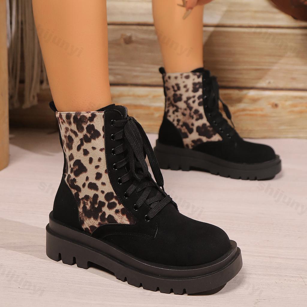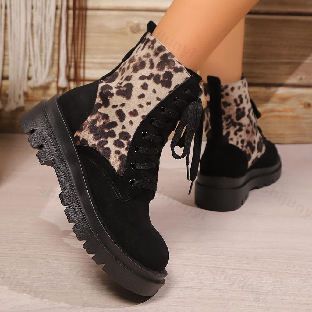 Мода 2024 года, новые женские ботильоны большого размера, модные леопардовые современные ботинки, женская обувь, дизайнерские короткие ботинки на танкетке со шнуровкой спереди