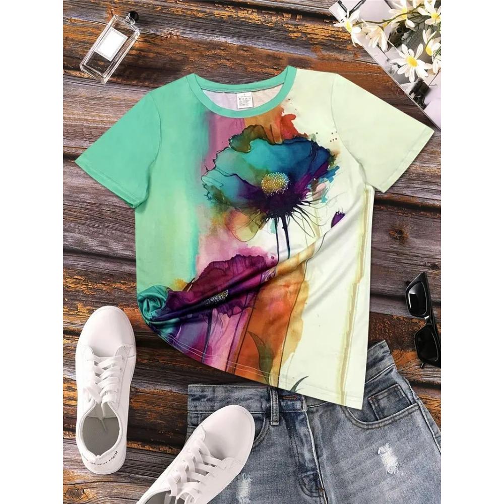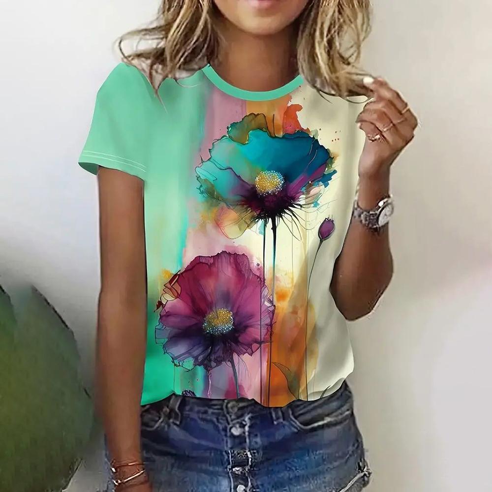 2024 Повседневная женская футболка с цветочным принтом, короткий рукав, свободные топы для женщин, модная женская одежда с круглым вырезом, летняя новая блузка
