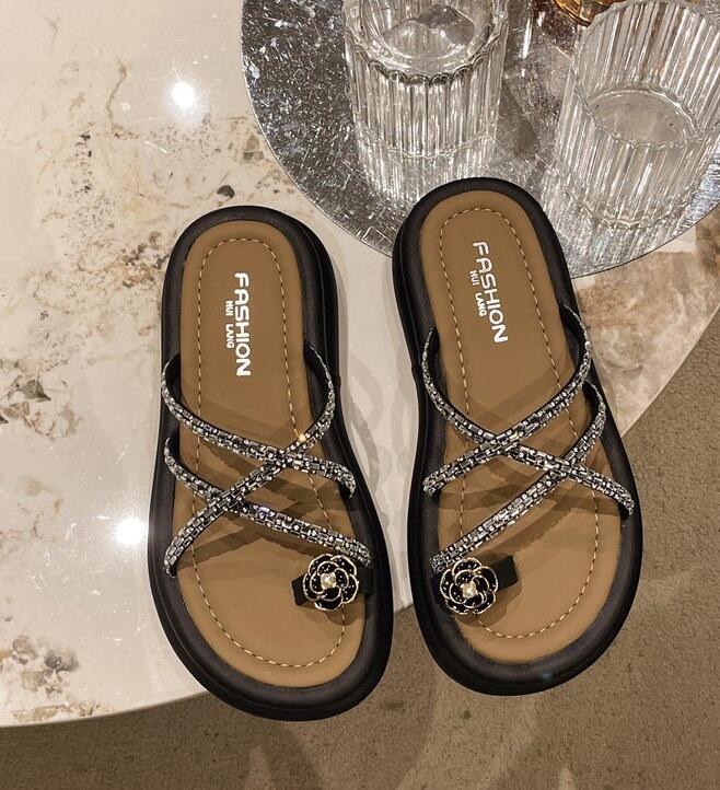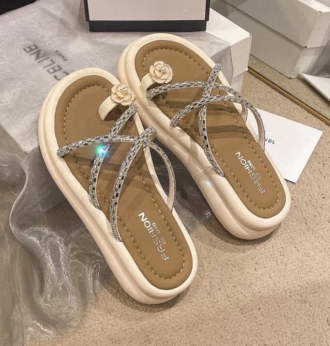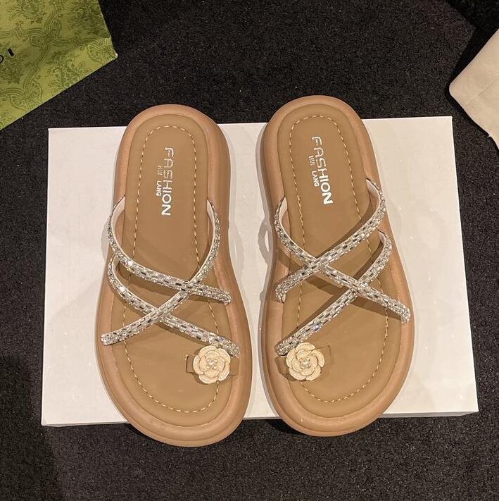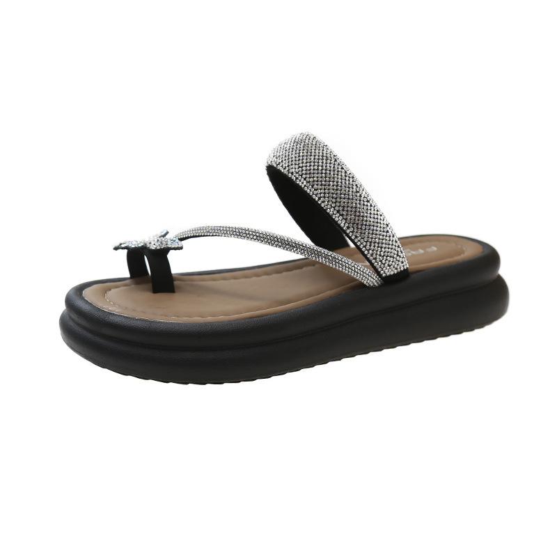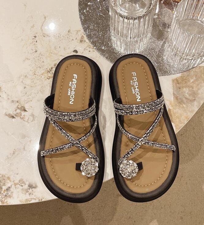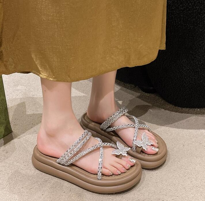 2024 Лето Новые Бабочки Яркие Алмазные Сандалии Женщины Носят Толстую Подошву Сложенный Носок Не Усталые Ноги Сандалии Пляжная Обувь