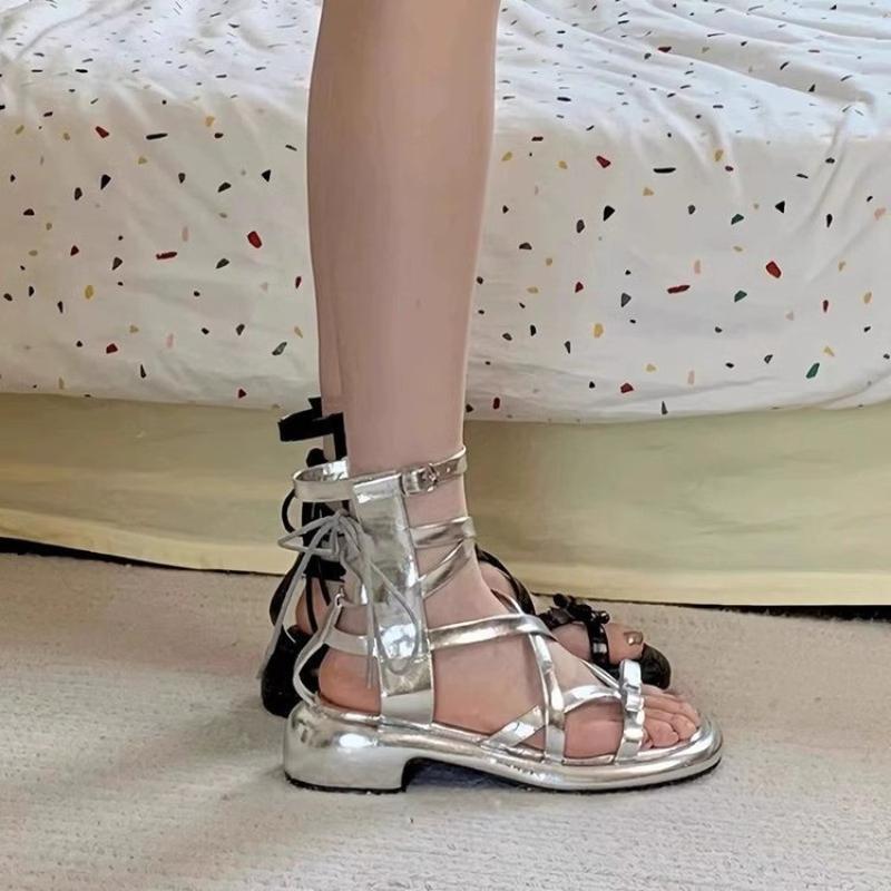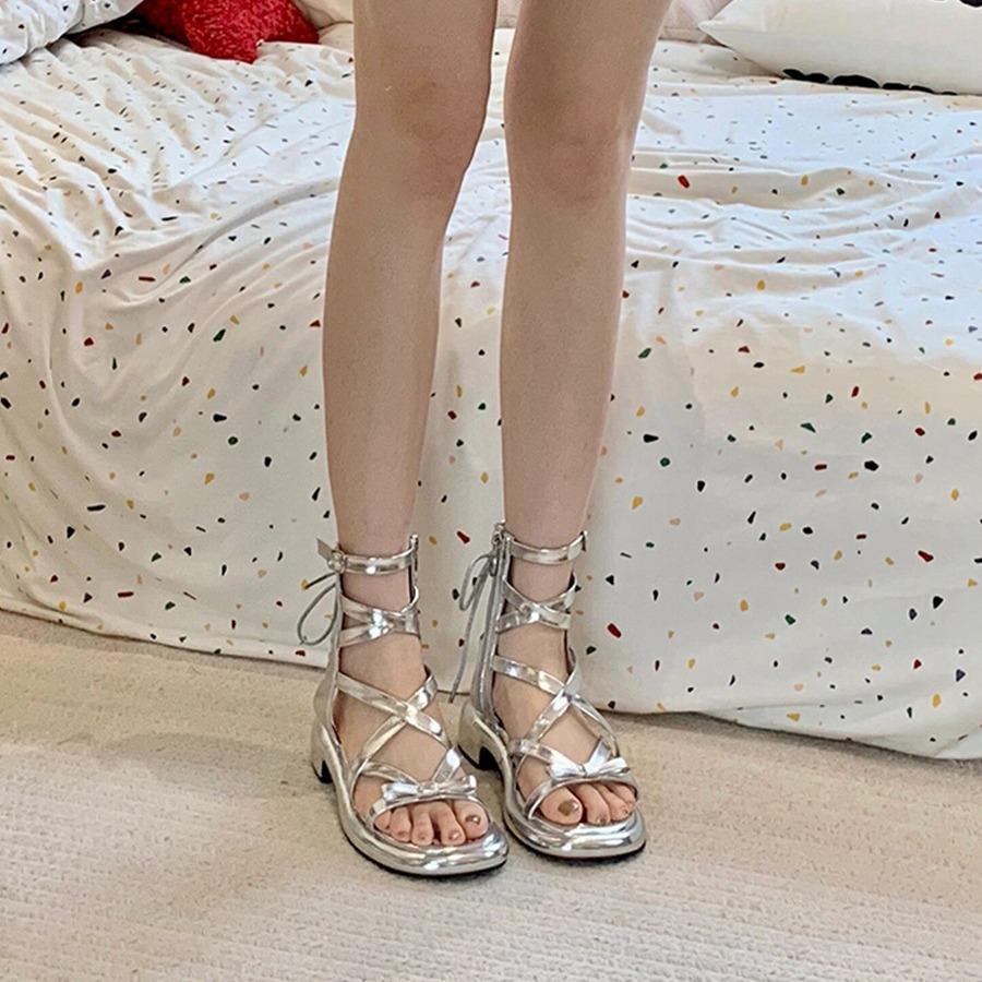 Французские сандалии Красивые феи Стиль с юбкой Бантик Перекрестная шнуровка Открытый носок каблук Пляжные римские туфлиjavascript: