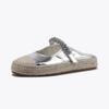 Мода 2024 года, лето, новые женские парусиновые туфли, серебристые мюли с блестками, сандалии с круглым носком на толстой подошве, женские пляжные туфли без застежек