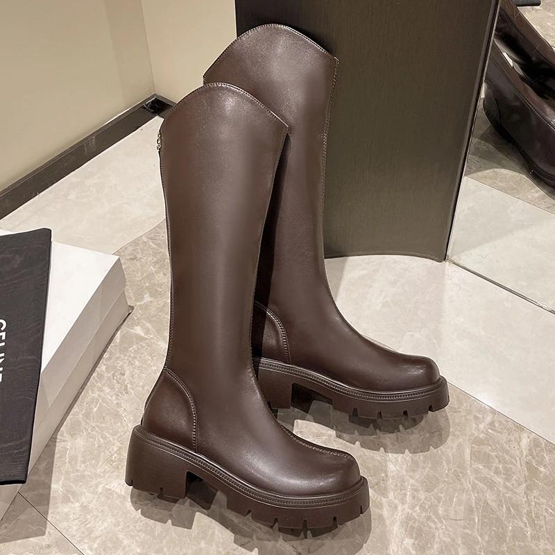 Модные женские сапоги «Челси» на высоком каблуке длиной до колена, зимние туфли на молнии 2024 года, дизайнерские классические туфли из искусственной кожи на платформе, новые удобные женские ботинки