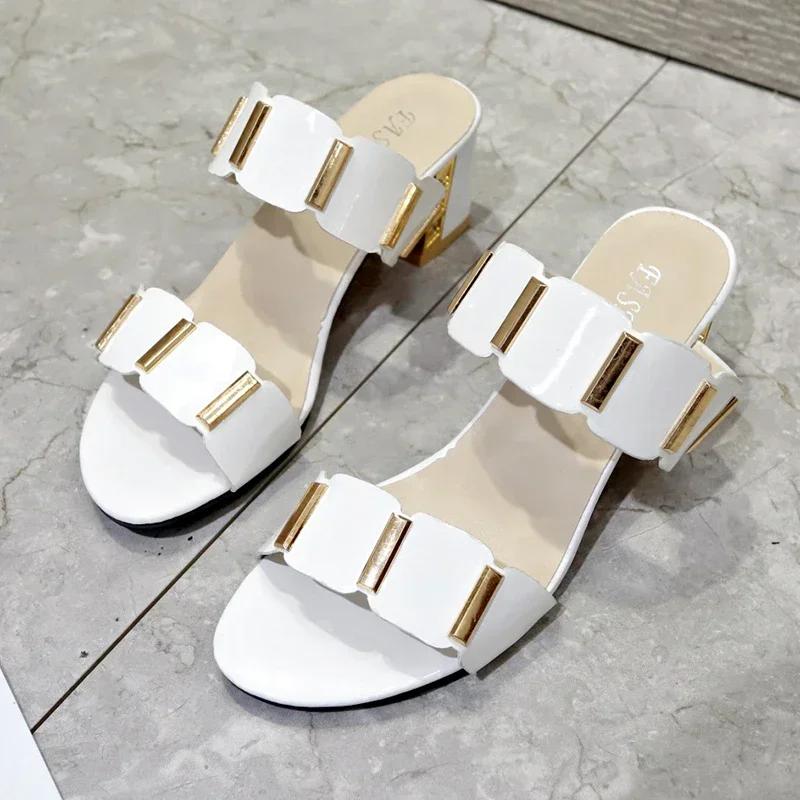 Модные летние женские тапочки в корейском стиле с квадратным каблуком, металлические декоративные тапочки на высоком каблуке для женщин, большие размеры, летние удобные