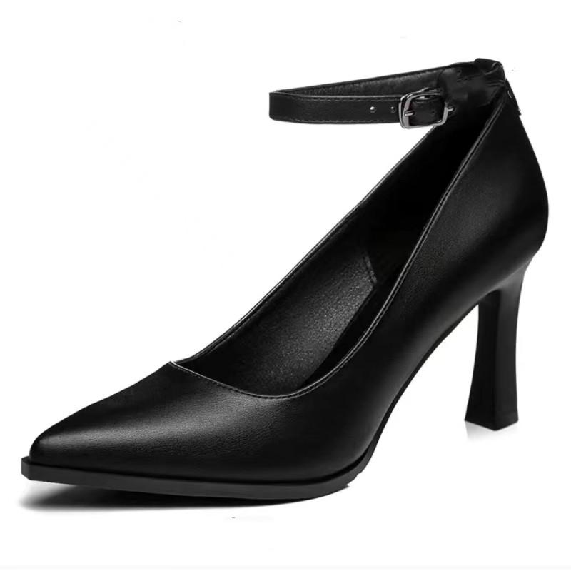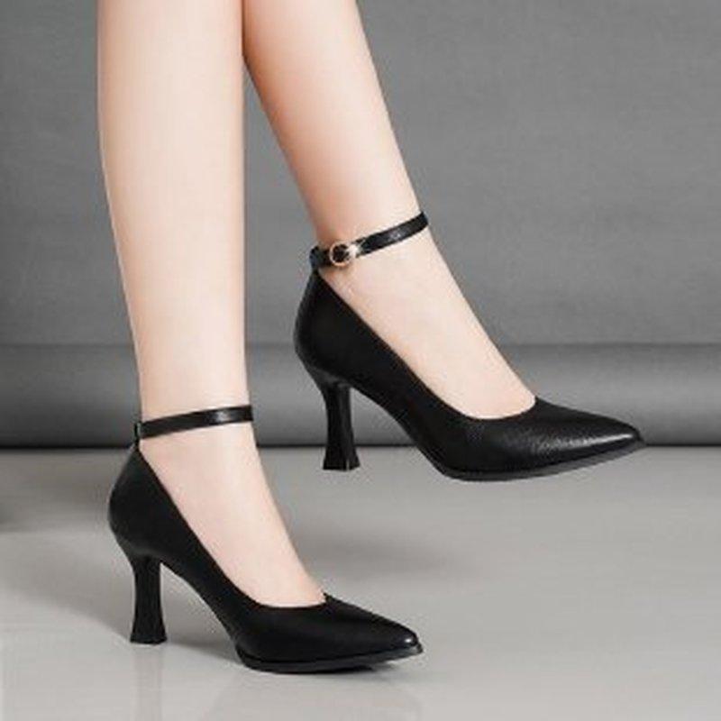 Мода 2024 года, лето, новые модные женские туфли с острым носком и неглубоким воротом, толстый каблук с пряжкой в виде слова, черные простые рабочие туфли