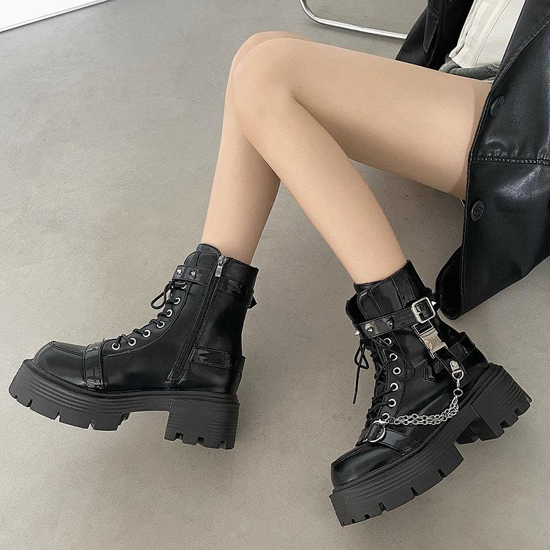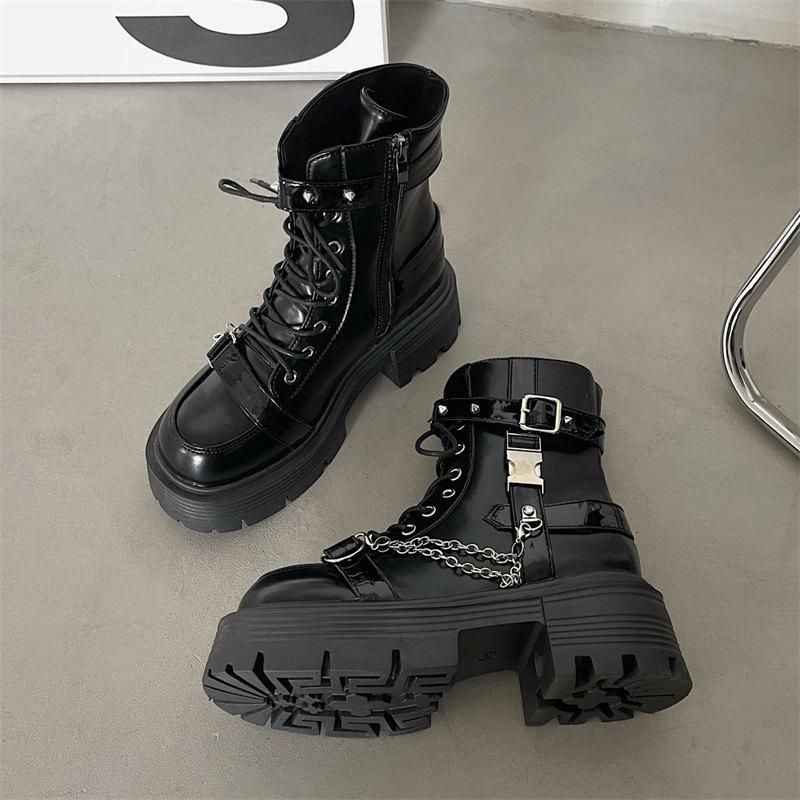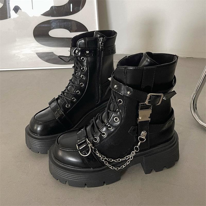 Мода 2024 года, новые готические ботильоны на платформе, женские модные панк-сапоги с пряжкой, молнией, заклепками, женские модные короткие сапоги с металлической цепочкой