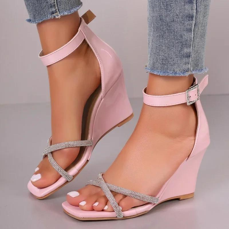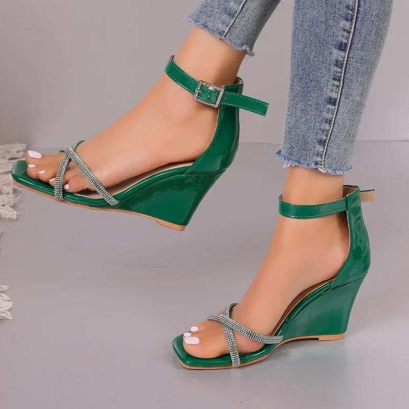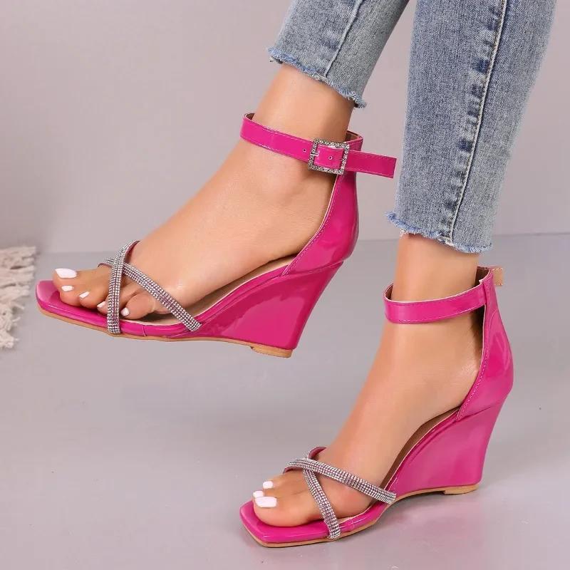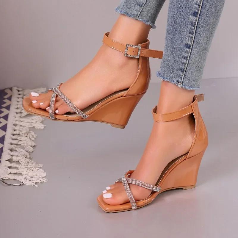 Модная женская обувь 2024 года, женские босоножки с закрытым каблуком, модные повседневные босоножки с кристаллами, женские новые босоножки на танкетке с открытым носком и пряжкой