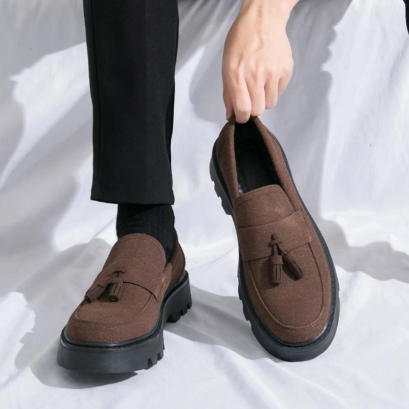Модная замшевая мужская обувь для вождения, без застежек, деловые туфли коричневого цвета на толстой подошве, туфли для вождения с кисточками, мокасины