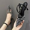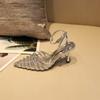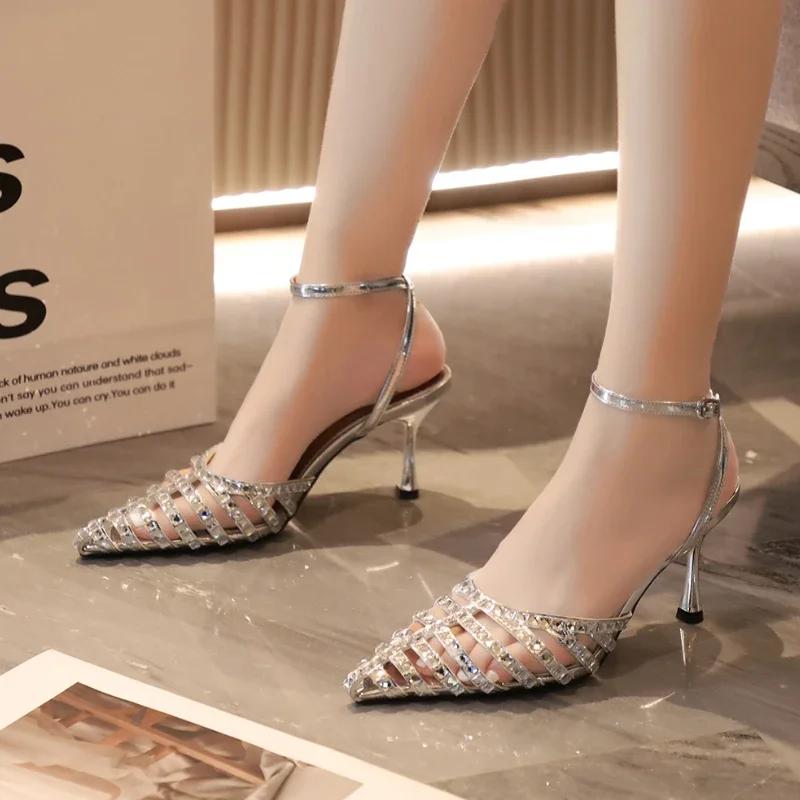 Модная женская обувь 2024 года, высококачественные женские босоножки с ремешком на щиколотке, летние сандалии с острым носком и пряжкой, туфли на шпильке или тонком каблуке, неглубокие босоножки