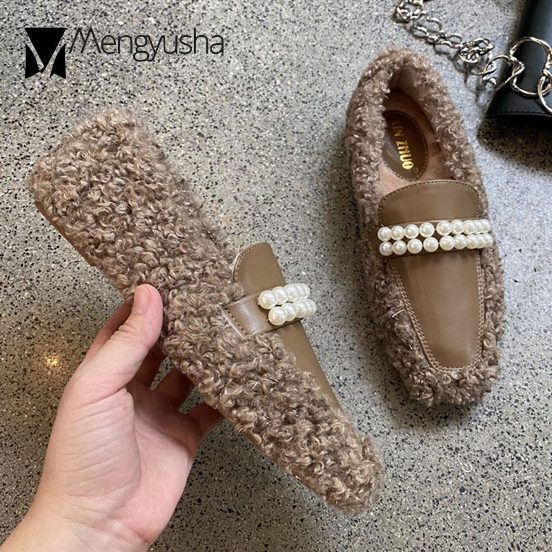 Модные туфли на плоской подошве из овечьей шерсти с квадратным носком, зимние меховые туфли для беременных женщин, балетки с бусинами, мокасины из вьющейся овечьей шерсти — купить товар онлайн с бесплатной доставкой по всему миру!