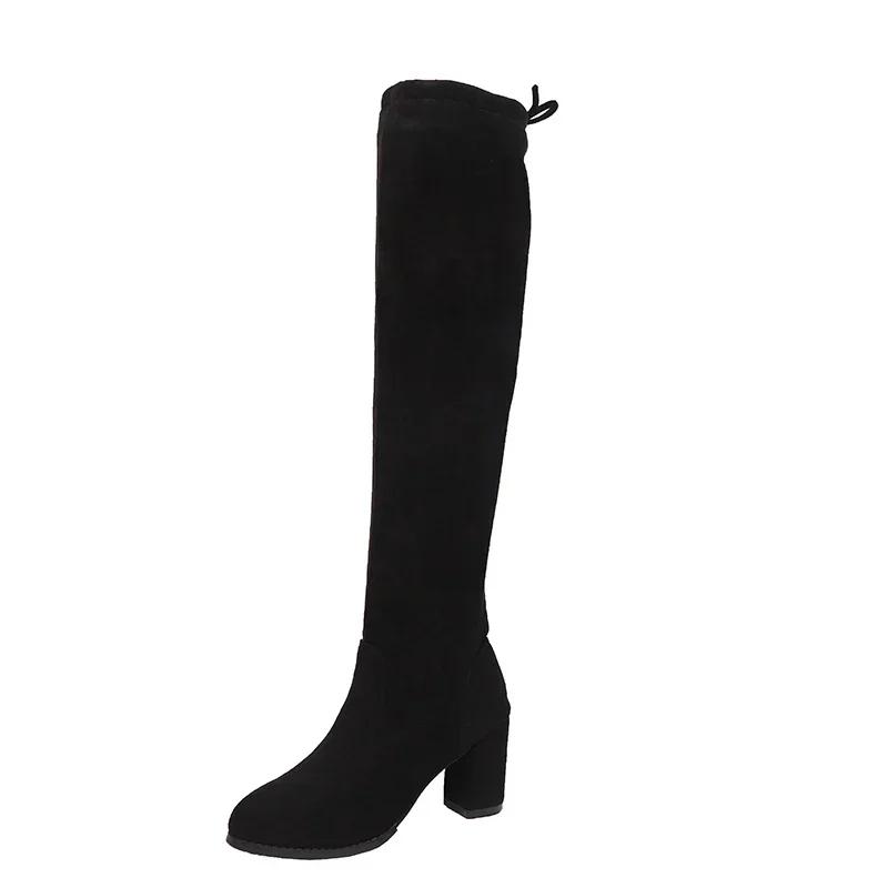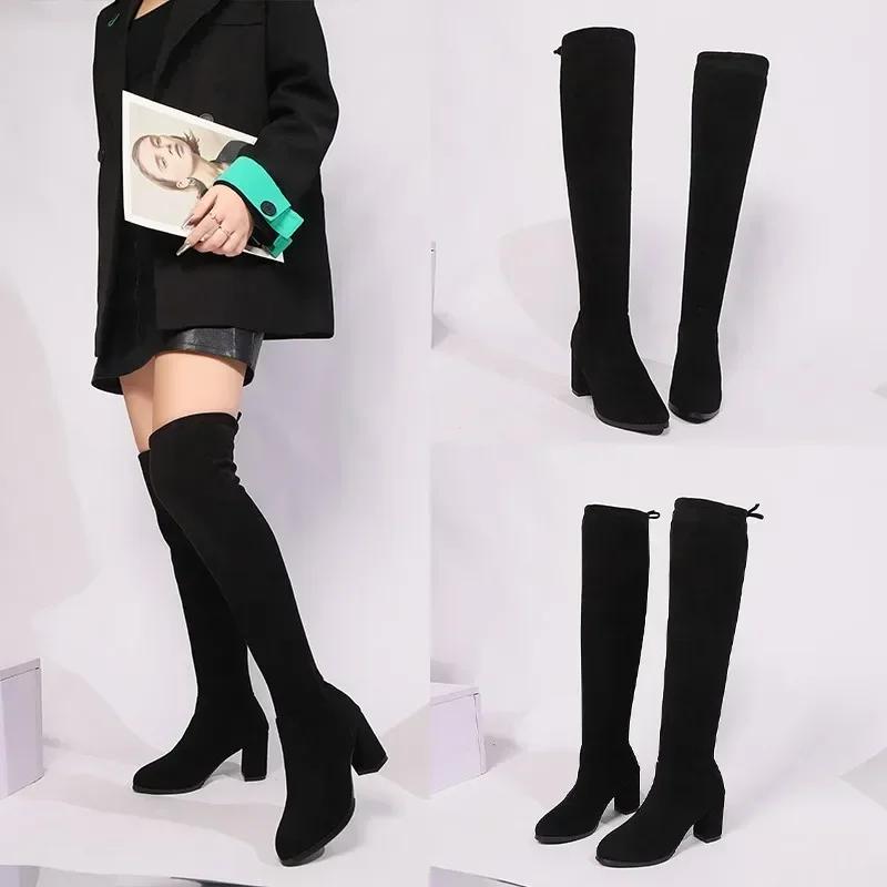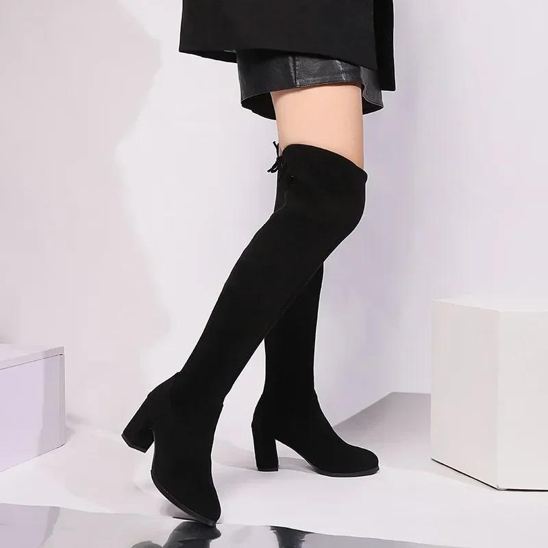 Распродажа модной женской обуви 2024 года, модные женские сапоги с рукавами, зимние замшевые однотонные высокие туфли на толстом каблуке, большие размеры