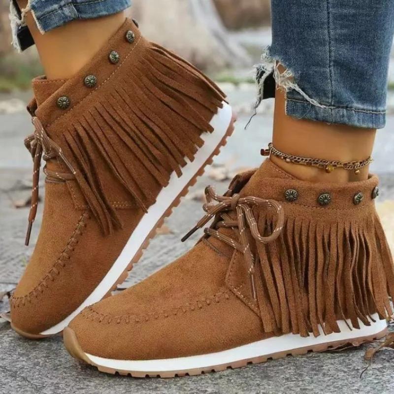 Мода 2024 года, высококачественная женская обувь, женские ботинки на шнуровке, модные современные ботинки с кисточками, женские новые заклепки, большие размеры, однотонные ботильоны