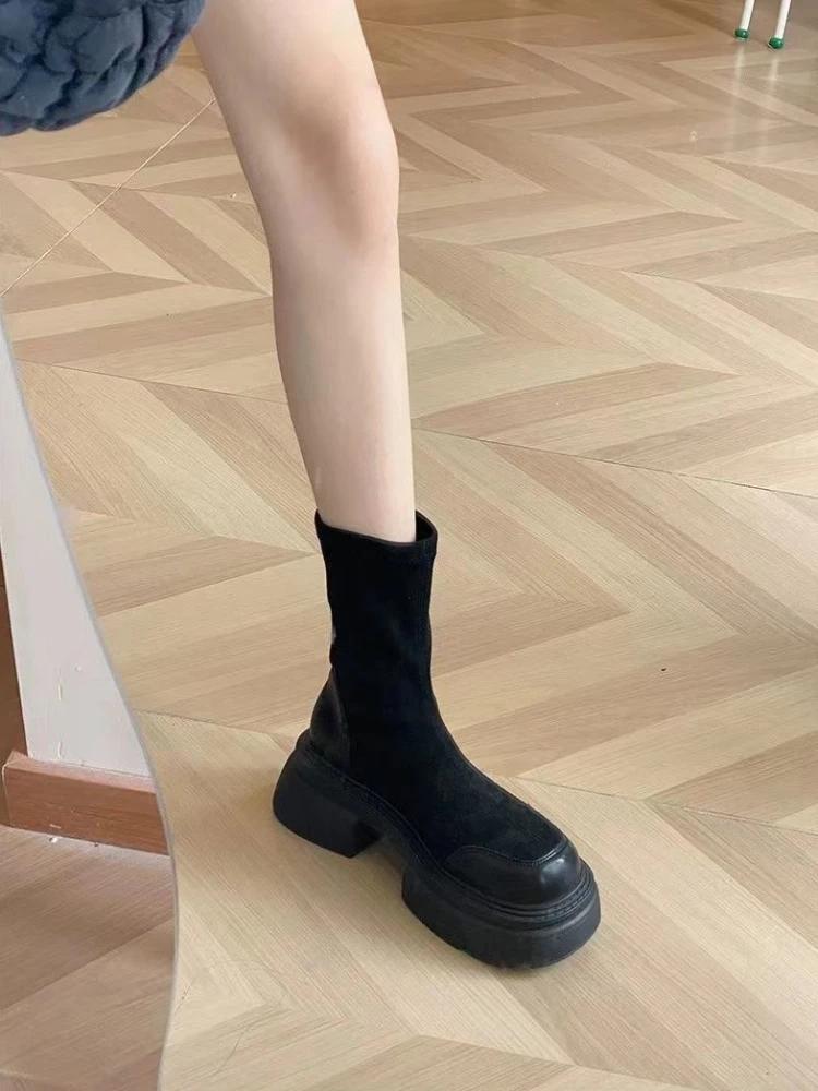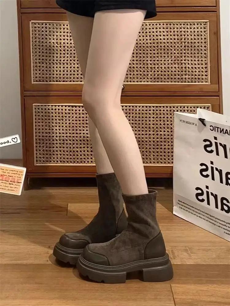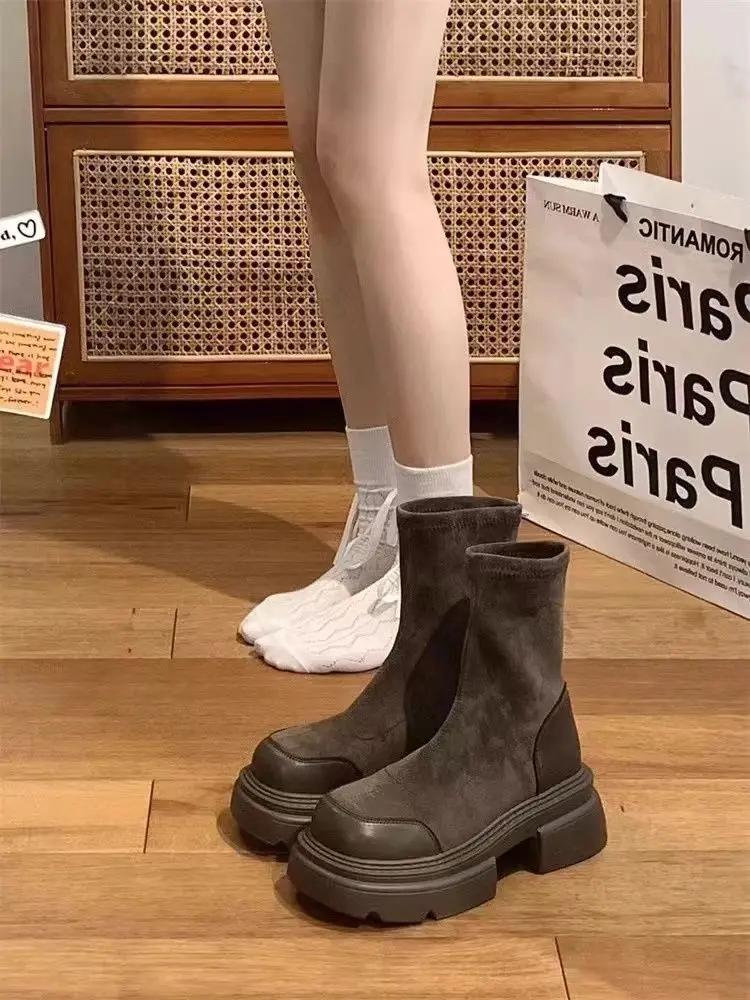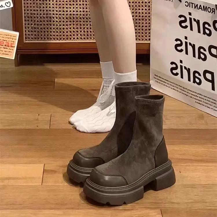 Модные коричневые ботильоны с круглым носком на платформе, женские короткие туфли, массивные ботильоны для женщин, эластичная замша, весна 2024, новинка, высокое качество