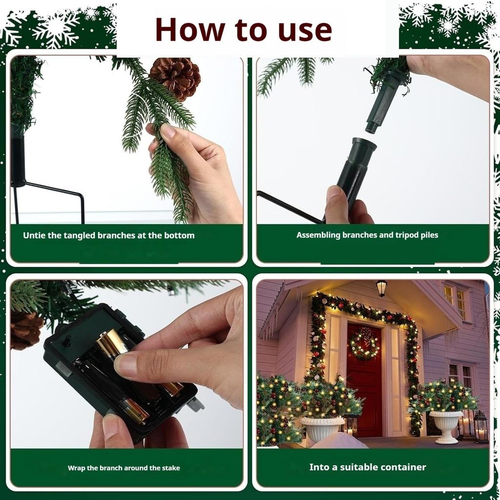 Простая установка: Наш колышек для искусственной рождественской елки оснащен прочным металлическим колышком с тремя зубцами, который надежно удерживает дерево, что делает его идеальным для праздничного украшения как внутри, так и снаружи помещения.. Наслаждайтесь надежной и устойчивой экспозицией вашей рождественской елки