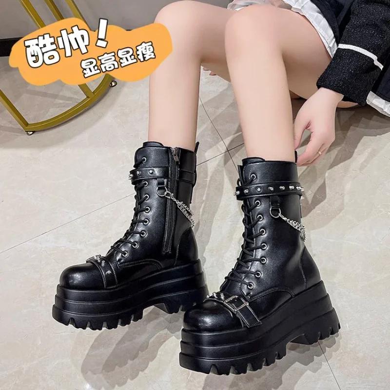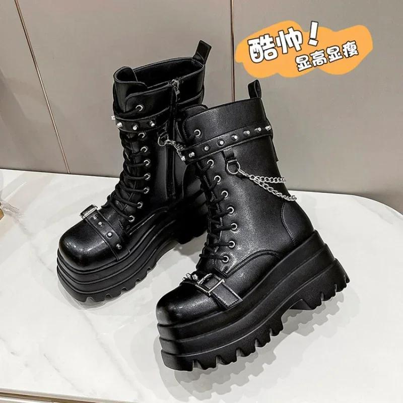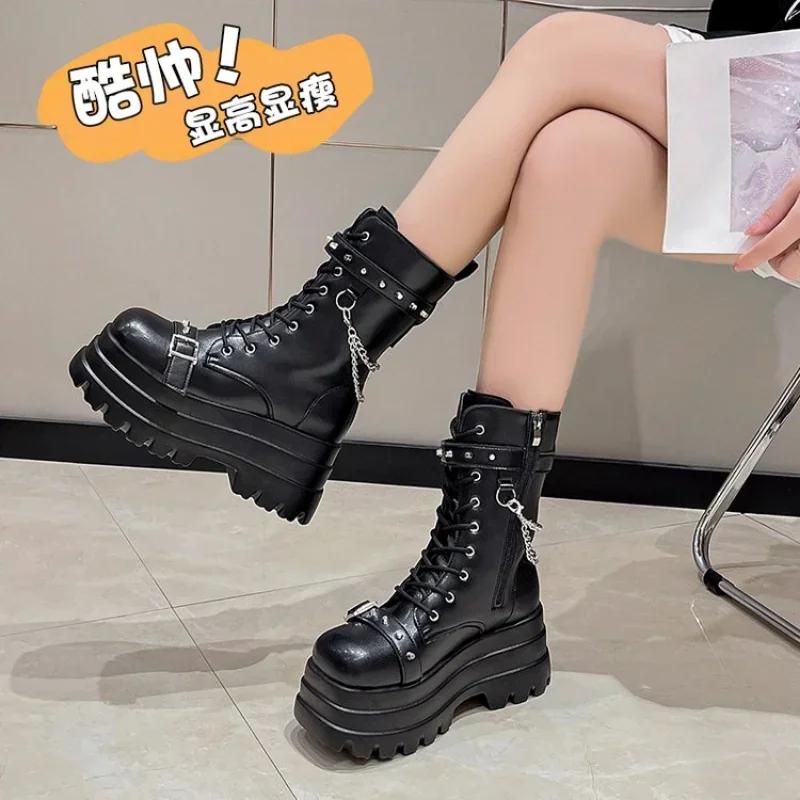 Готические сапоги на платформе, толстые, с пряжкой, осенние туфли, женские сапоги на танкетке, высокие сапоги до колена, панк-стрит, косплей, ботинки с цепочкой для мотоцикла