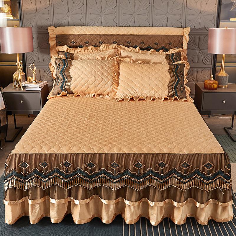 Комплект из 3 однотонных, приятных для кожи простеганных ромбовидных сеток с цветочным узором + рельефный кружевной слой для кровати, 1 шт. Подзор для кровати + 2 наволочки