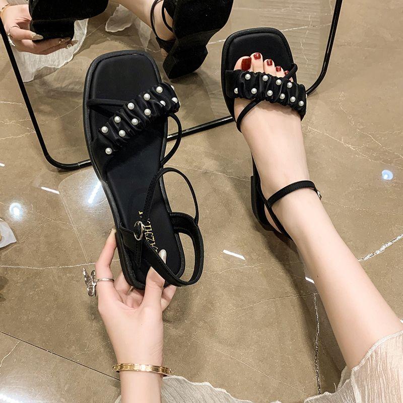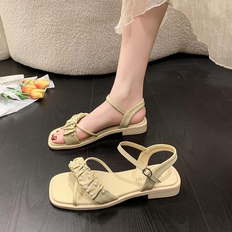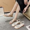 Footwear Beige One Word Sandals for Woman with Low Heels Summer 2024 Rhinestones Women's Shoes Diamond Trend Chic and Elegant H