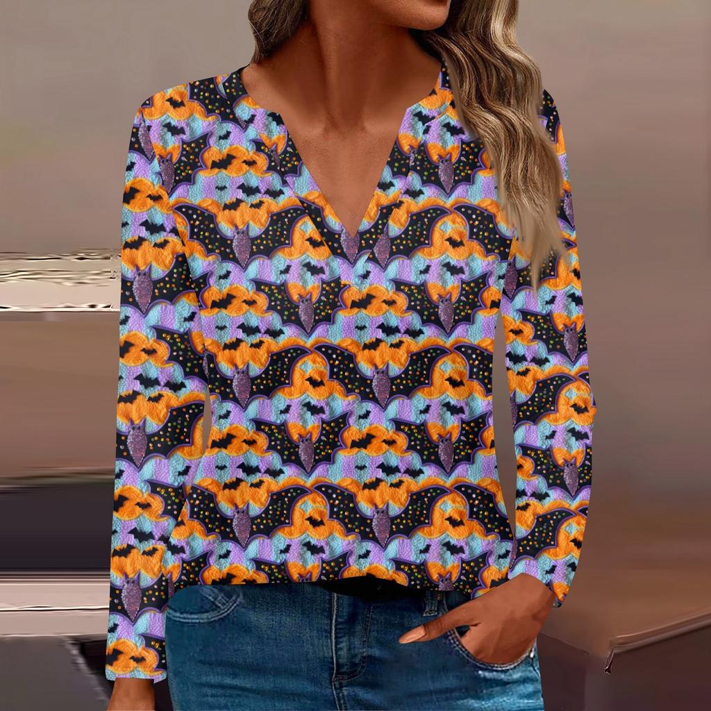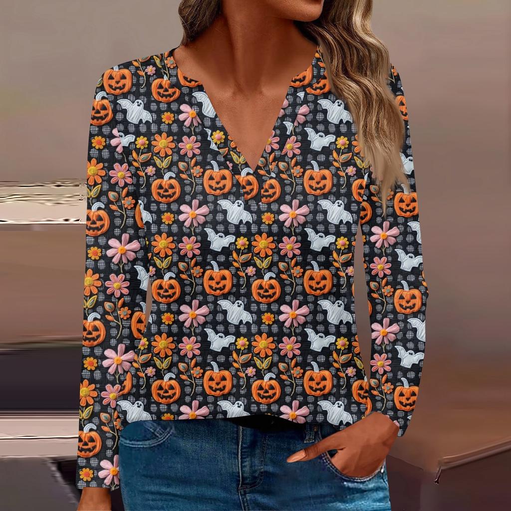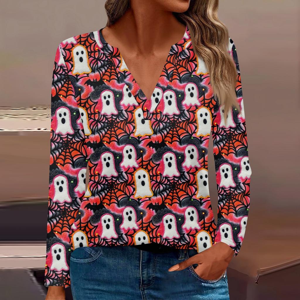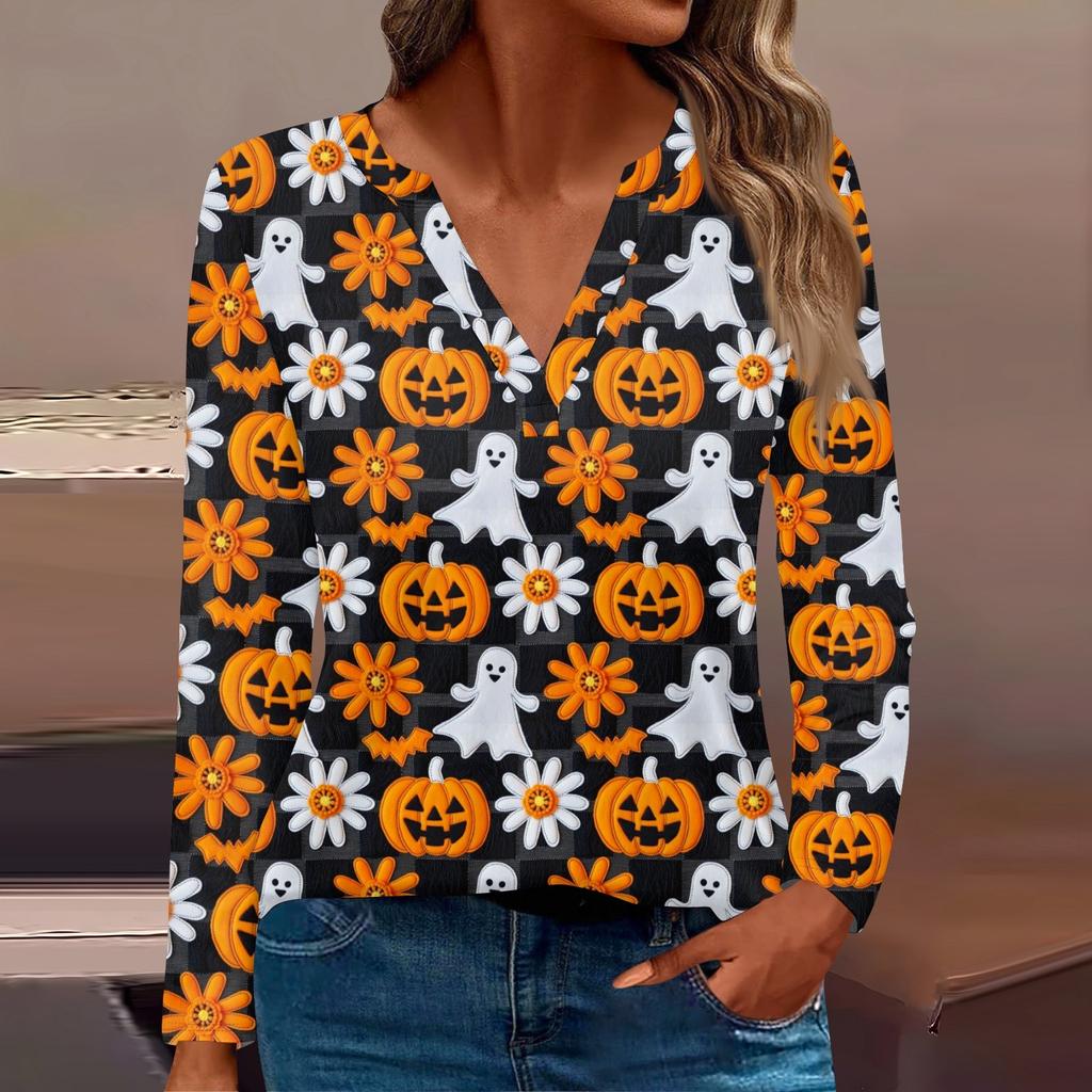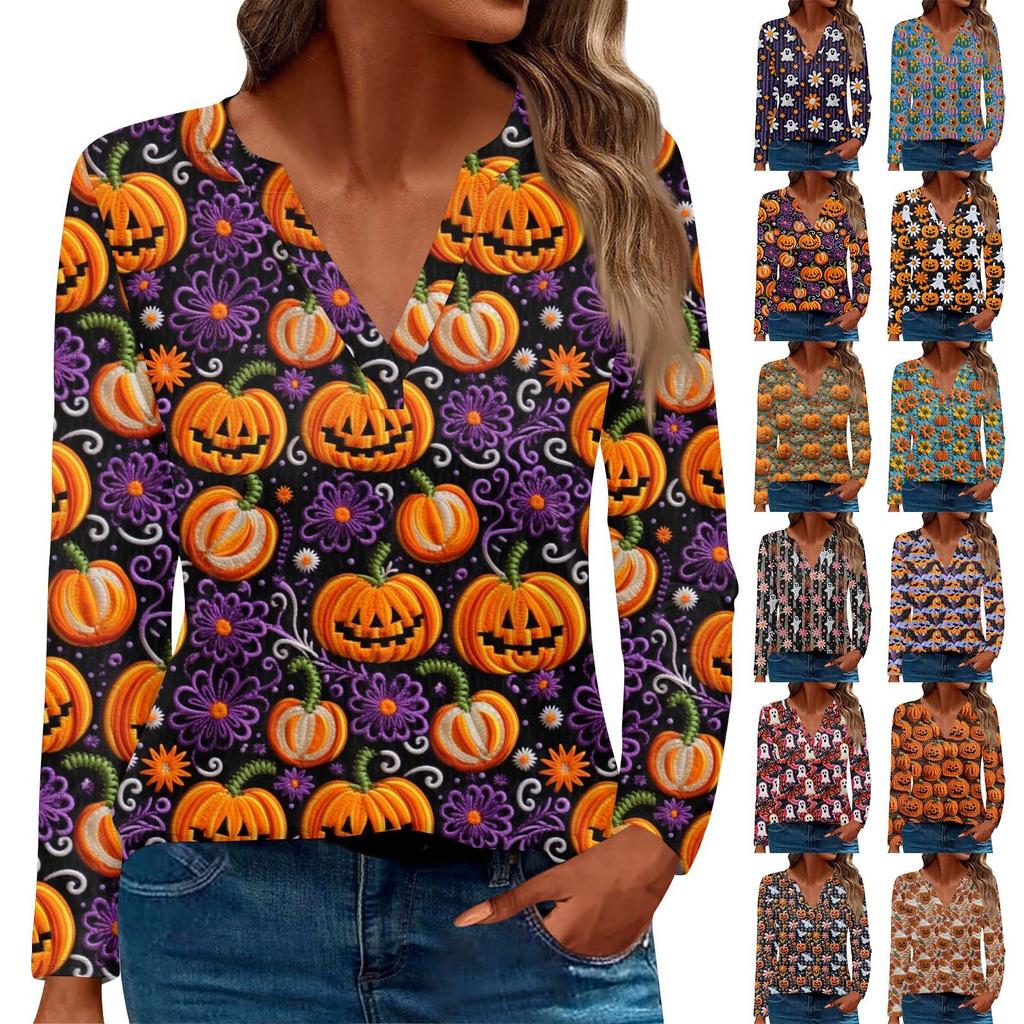 Женская мода с длинным рукавом V-образным вырезом и принтом на Хэллоуин в стиле кэжуал