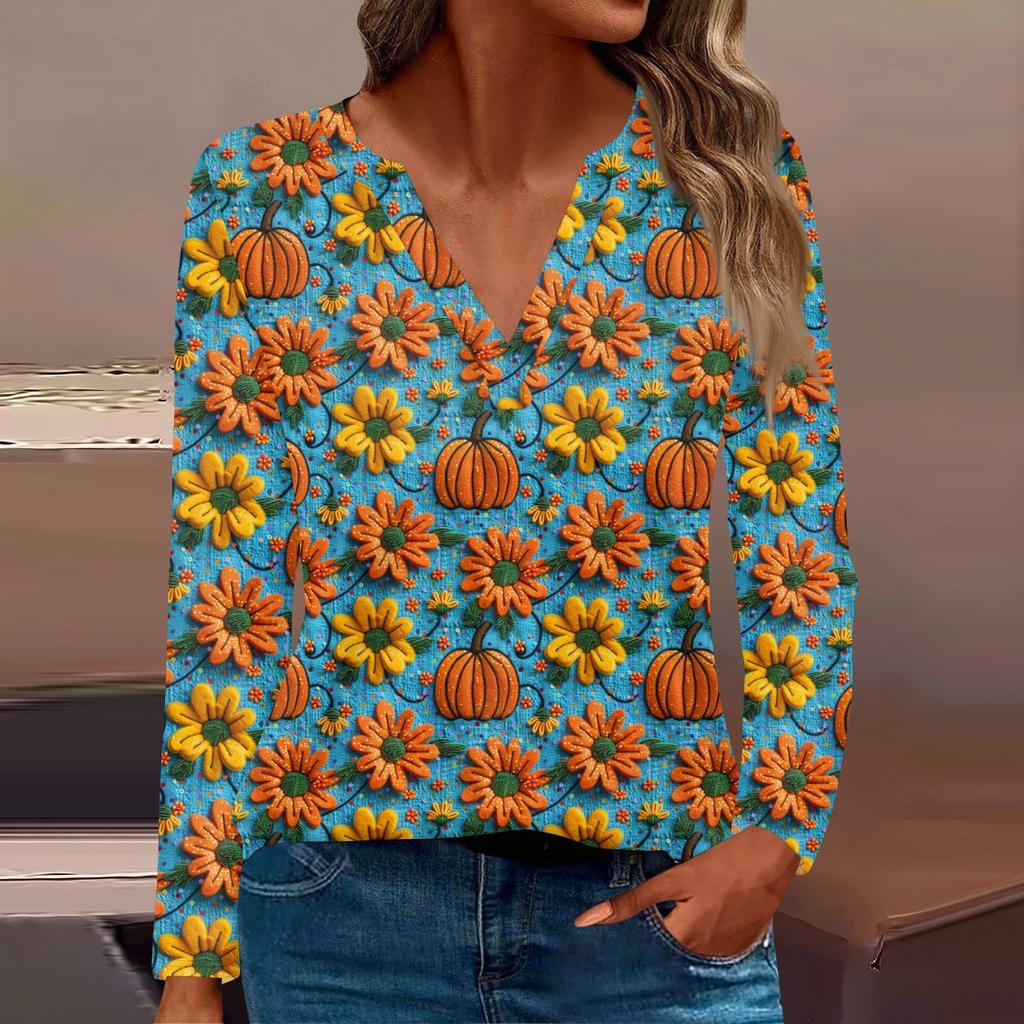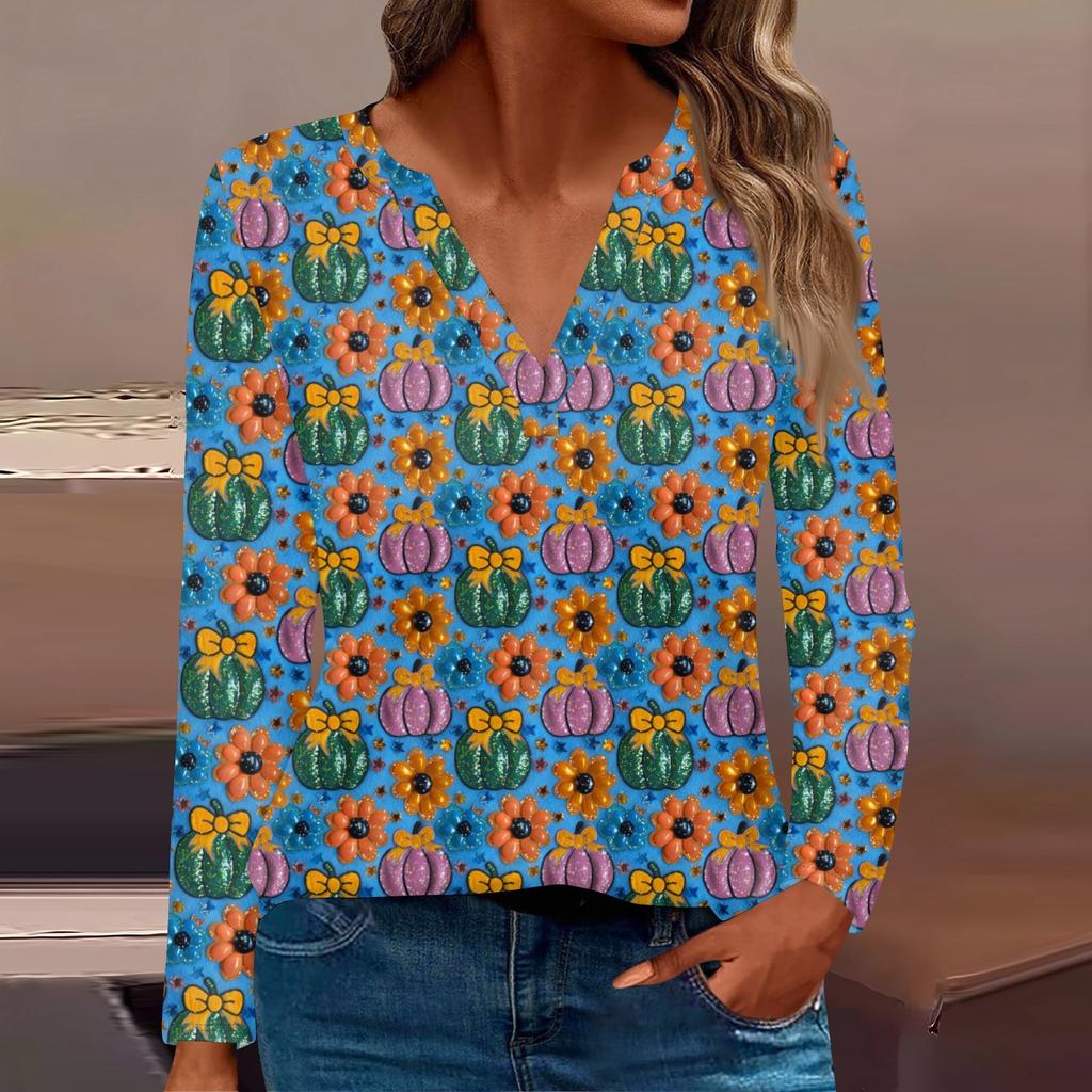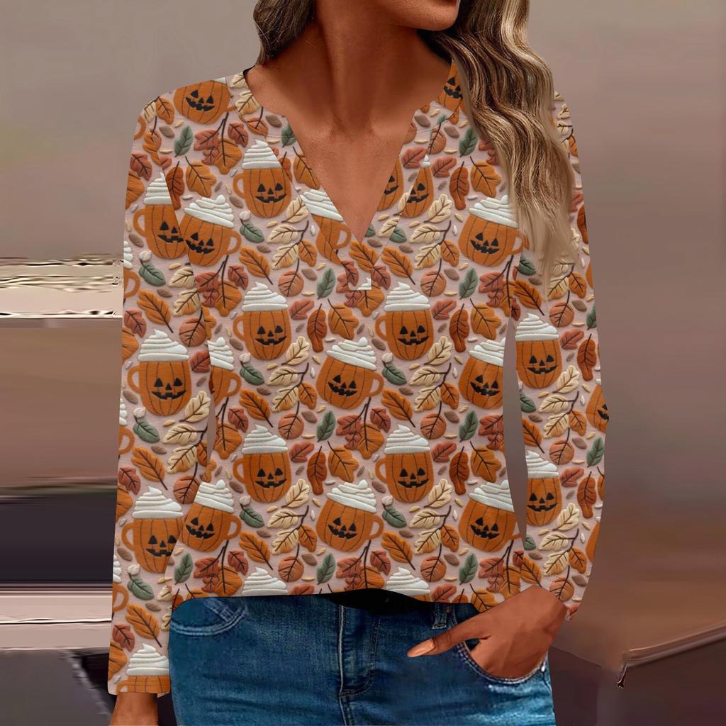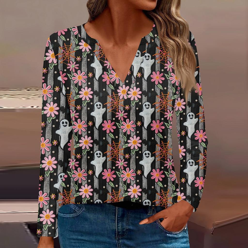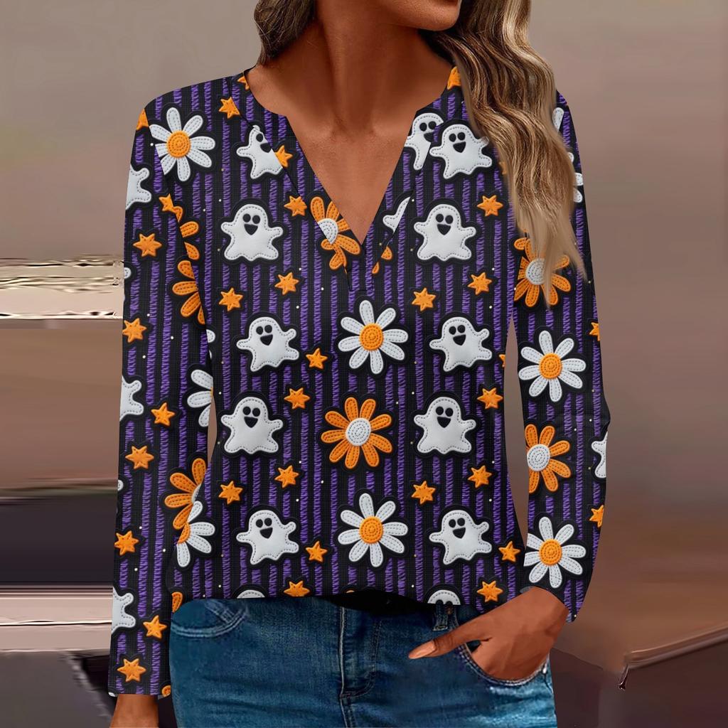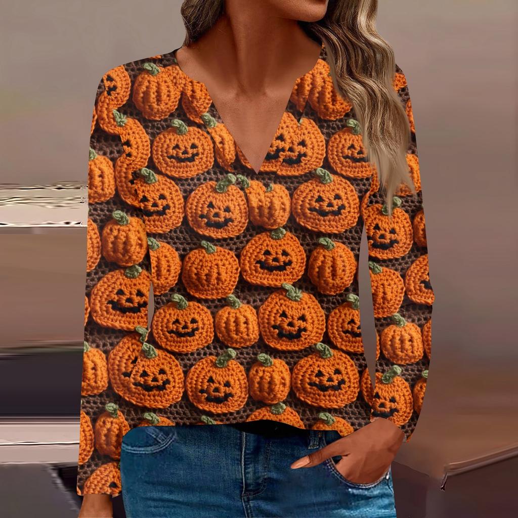 Женская мода с длинным рукавом V-образным вырезом и принтом на Хэллоуин в стиле кэжуал