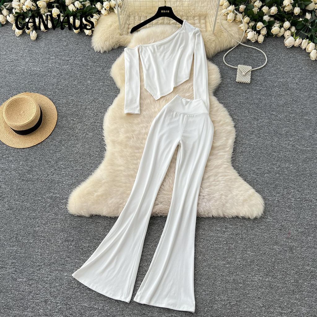 Сексуальная косая горловина без бретелек длинный рукав асимметричная футболка топ женский высокая талия тонкий пакет бедра микро брюки костюм — купить товар онлайн с бесплатной доставкой до всему миру!