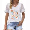 Женская летняя футболка больших размеров с V-образным вырезом, короткими рукавами, цветочным принтом и кружевными рукавами