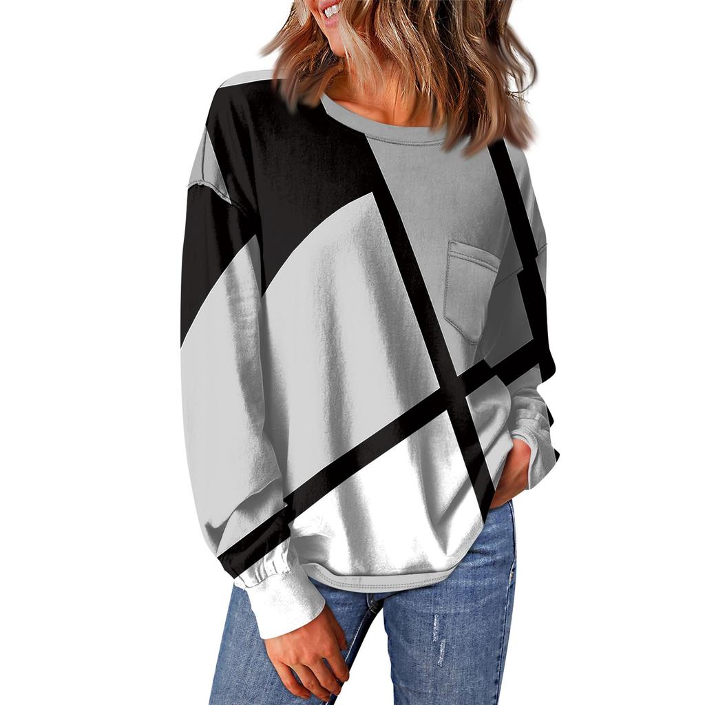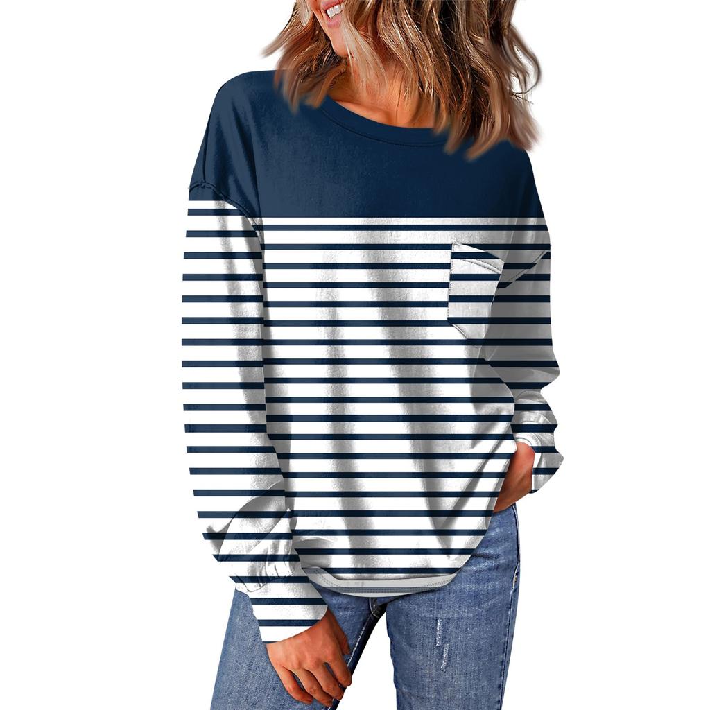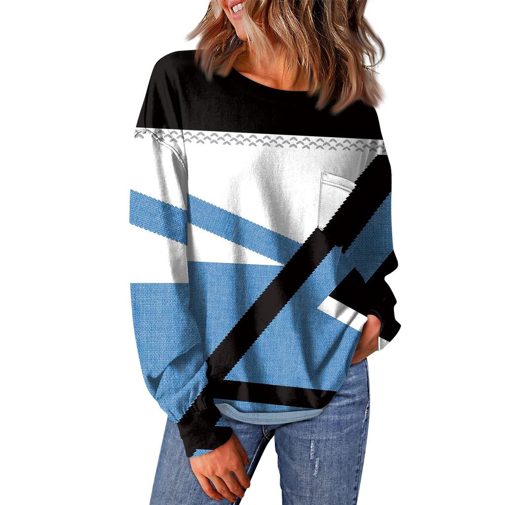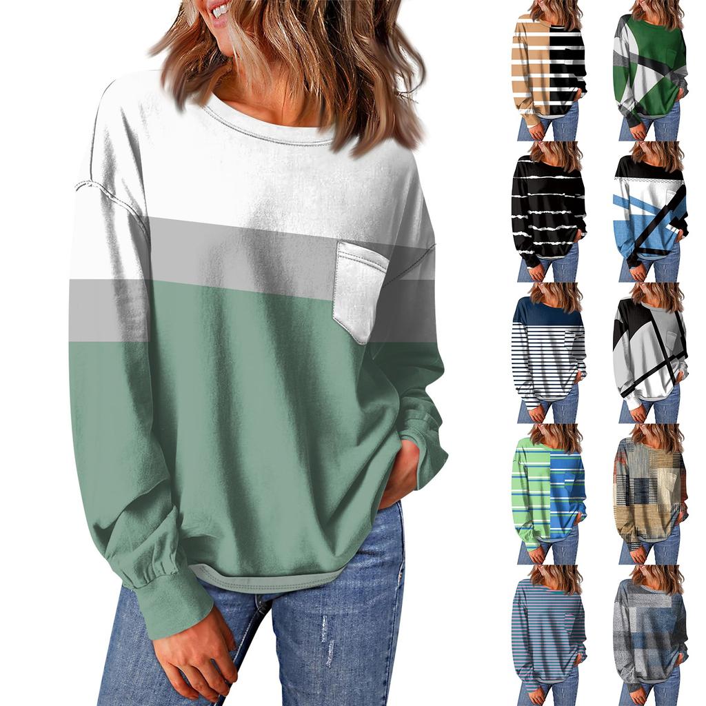 Женский повседневный свободный топ с круглым вырезом и карманами в полоску с принтом в стиле пэчворк и длинными рукавами