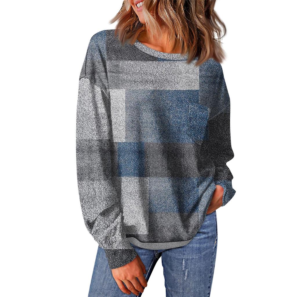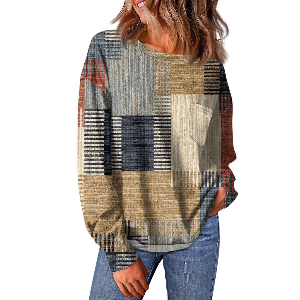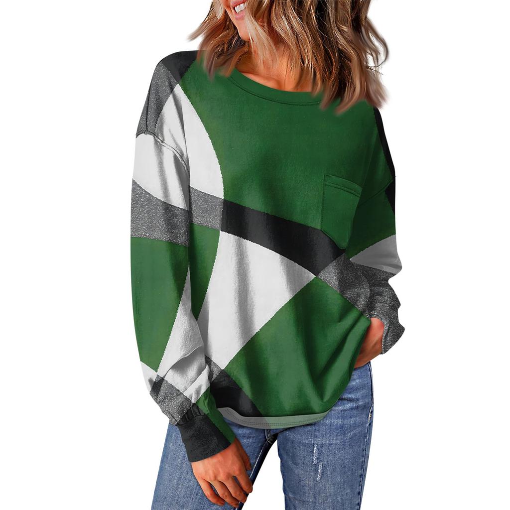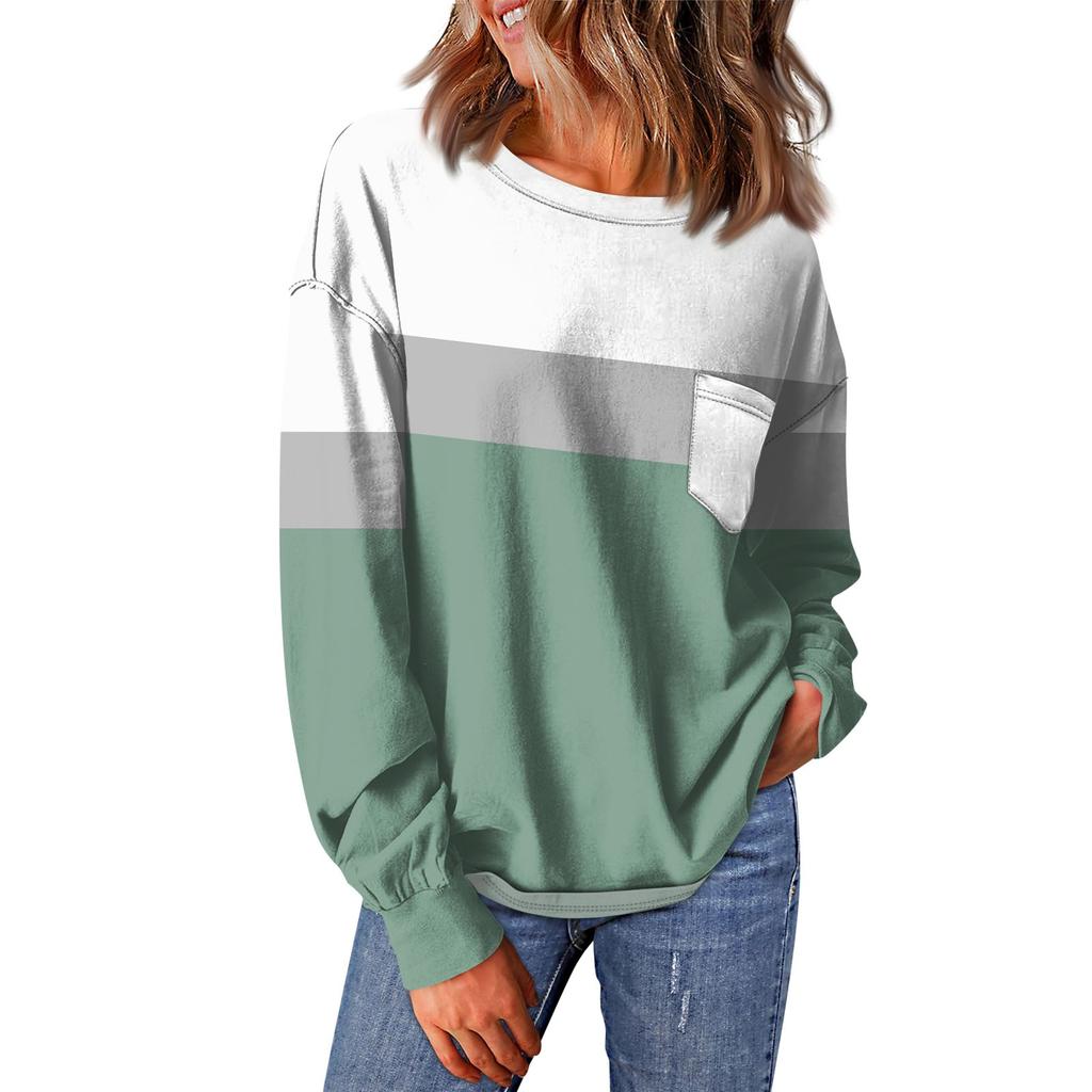 Женский повседневный свободный топ с круглым вырезом и карманами в полоску с принтом в стиле пэчворк и длинными рукавами