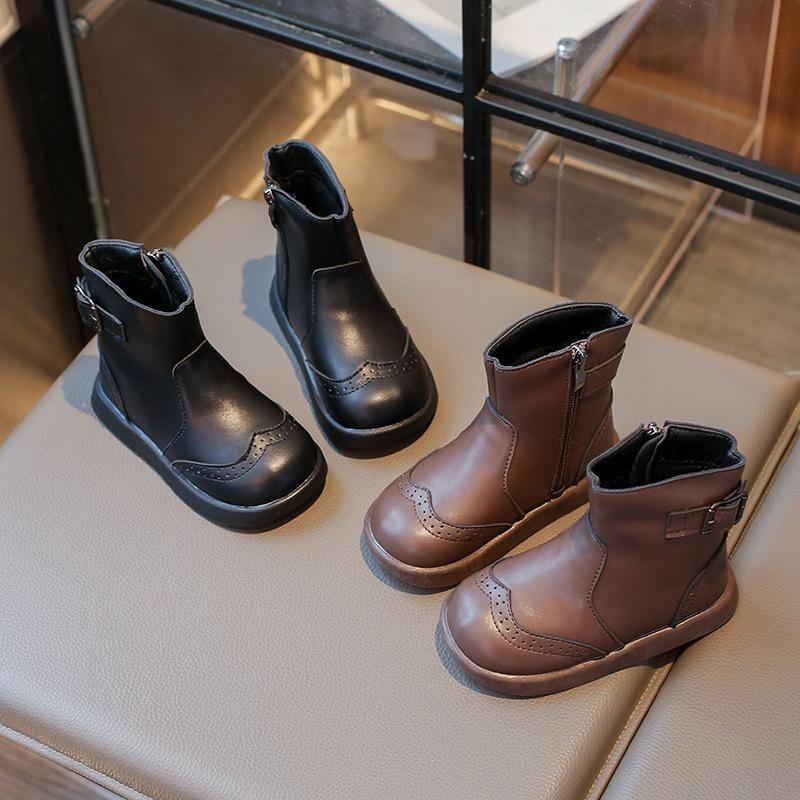 Зимние ботинки для девочек в британском стиле, однотонные повседневные детские кожаные ботинки, теплые плюшевые детские модные хлопковые ботинки до щиколотки, универсальные